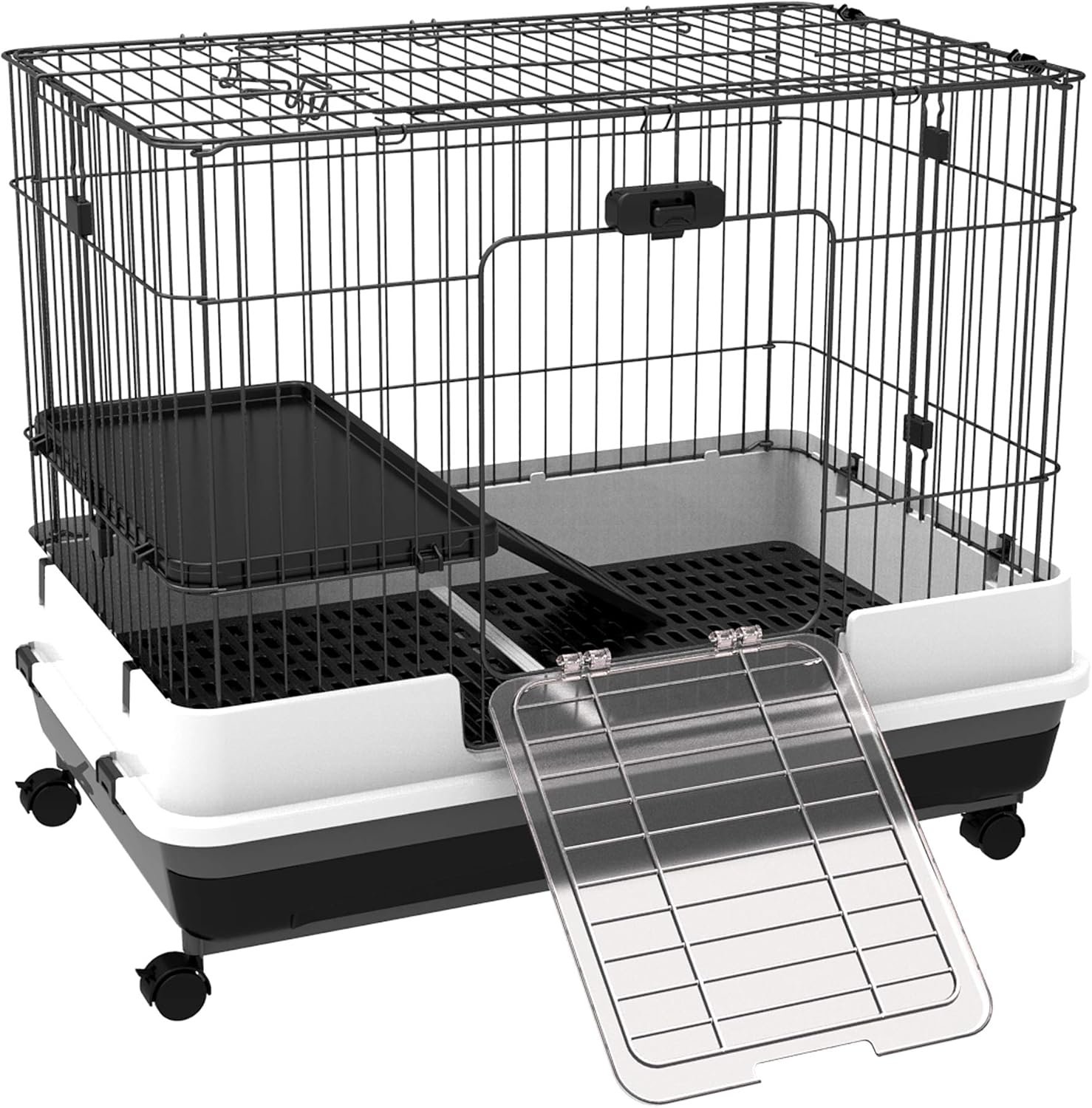 Deluxe Animal Cage: This wheeled indoor fancy 2-level habitat in beautiful black and white colors is great for your small pet to live.Ideal for small pet of large size such as rabbits, pet mink, chinchillas, etc. Note: Not suitable for hamster and rat.