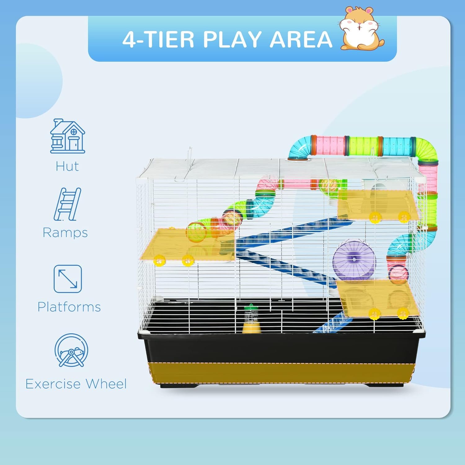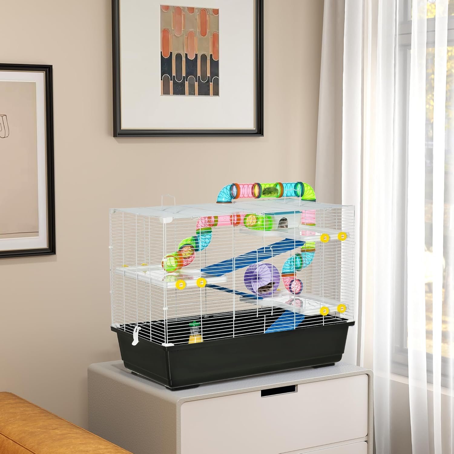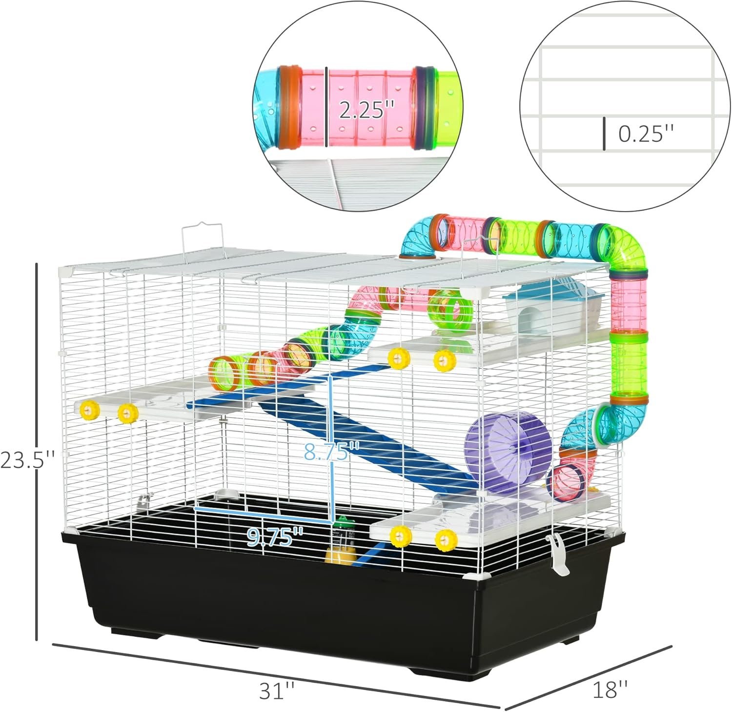 PawHut 31″ Large Hamster Cage, Small Animal House, Multi-Storey Gerbil Haven, Tunnel Tube System, with Water Bottle, Exercise Wheel, Food Dish, Ramps, Black