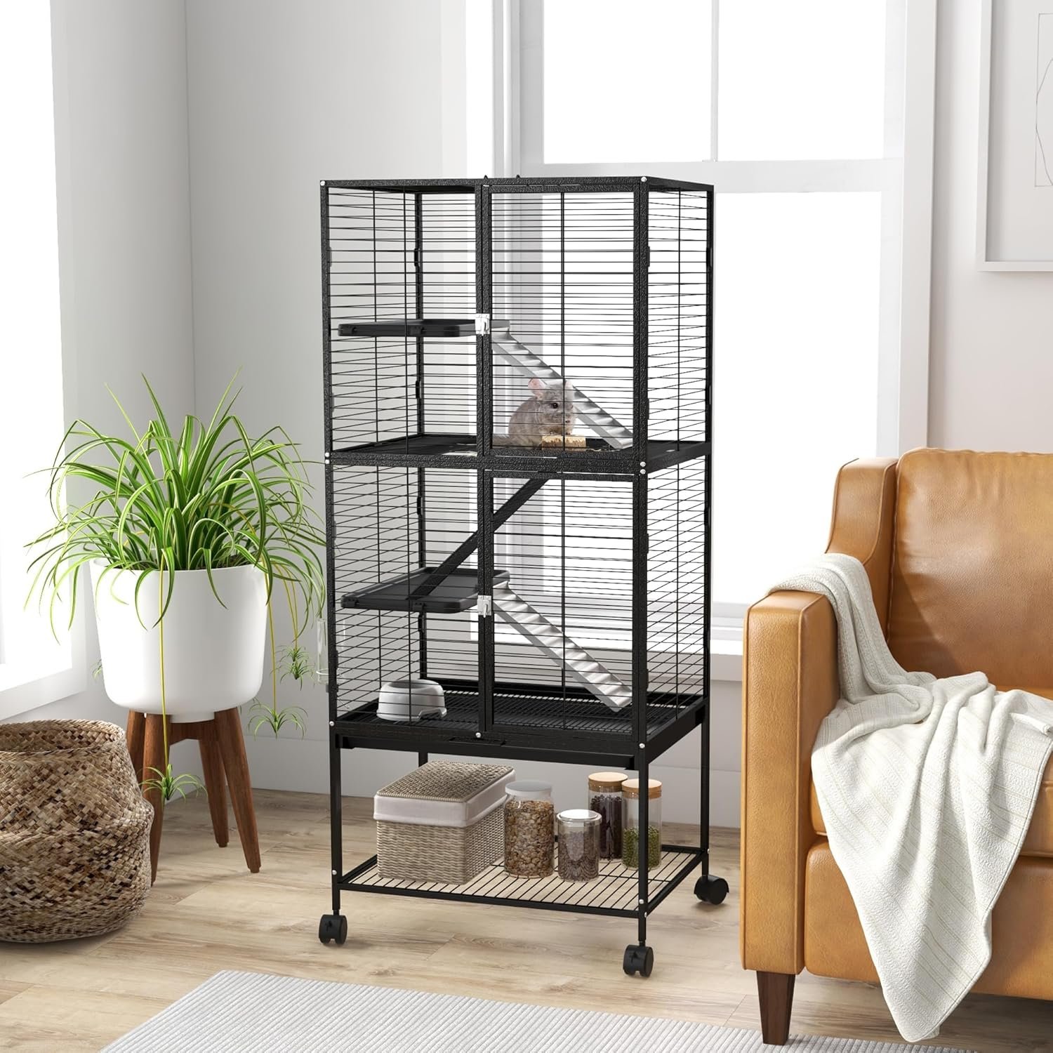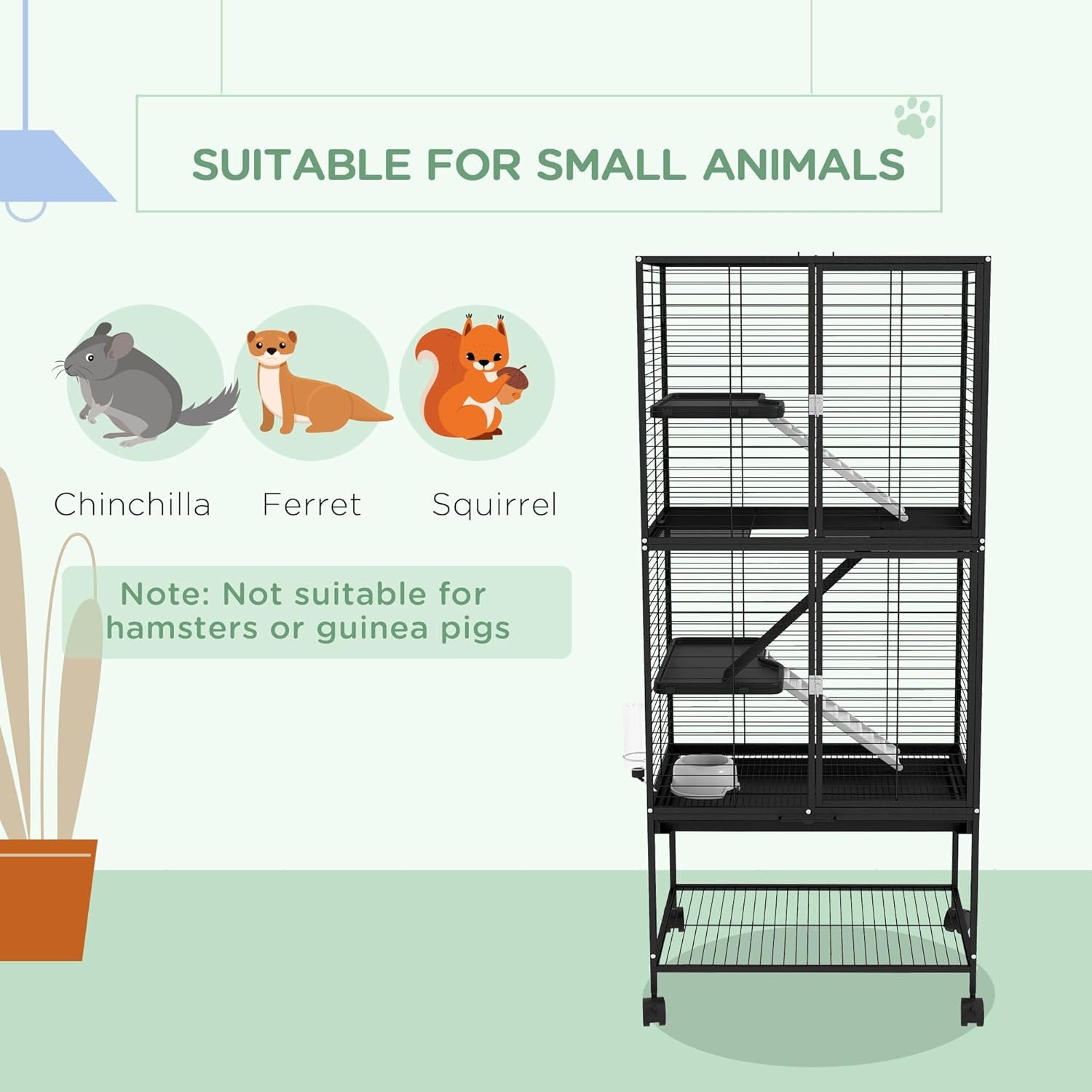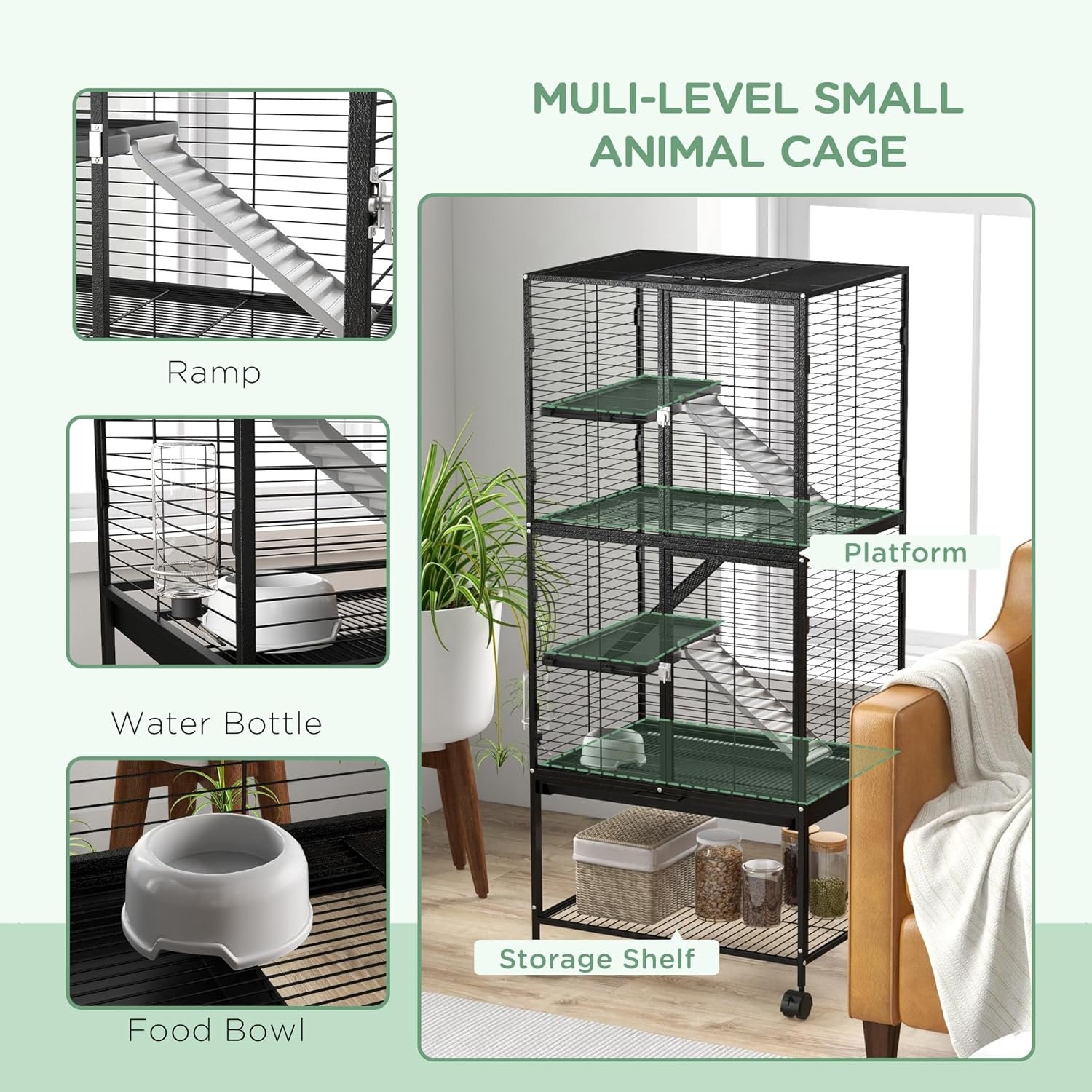 Spacious Cage: Includes two platforms with ramp – lots of space for pets to roam, and plenty of space for your decoration. Suitable for ferrets, chinchillas, guinea pigs and kittens.