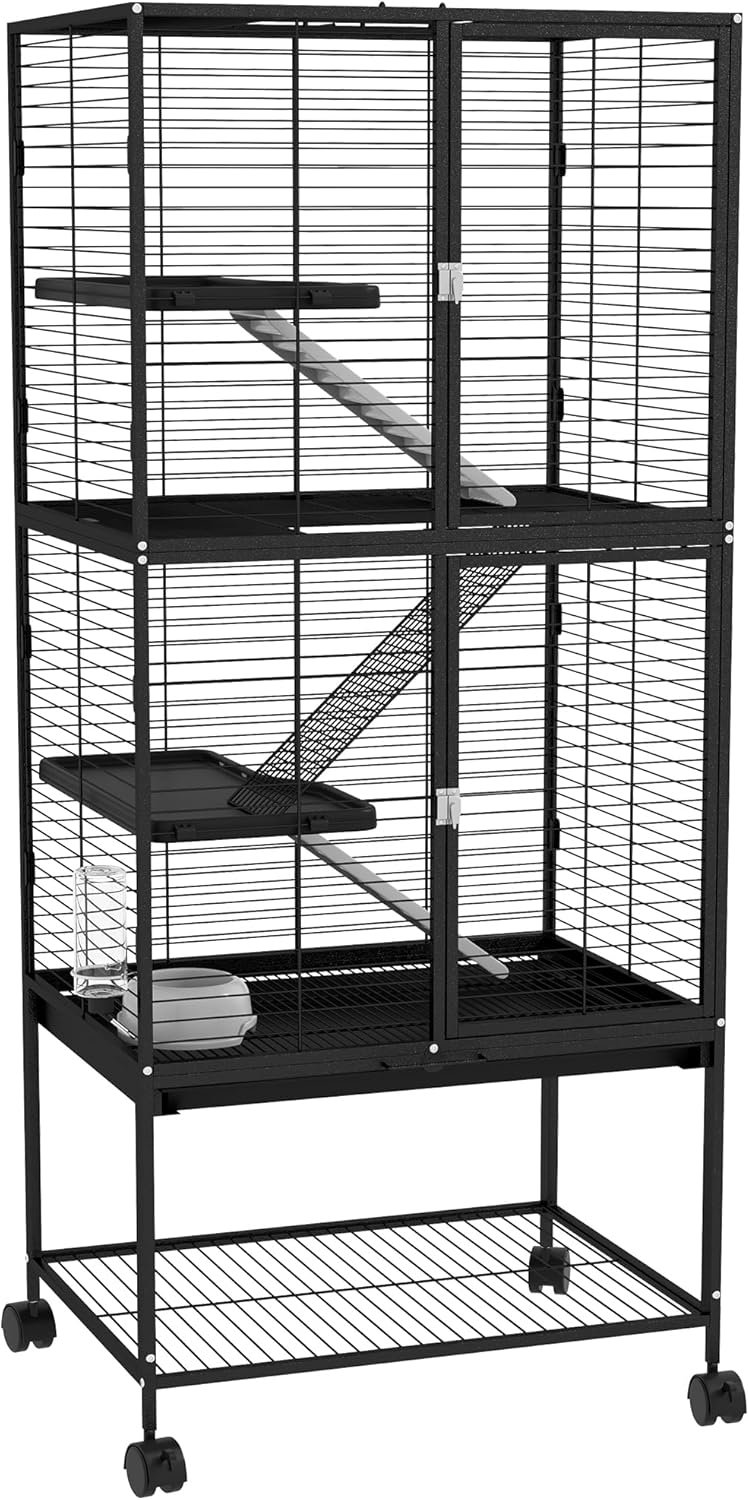 PawHut 53.5″ H Ferret Cage, 4-Tier Rolling Rat Cage for Chinchillas, Rabbits, Squirrel, Small Animal Habitat with Bottom Storage Shelf, Removable Tray, 24″ x 18″ x 53.5″, Black