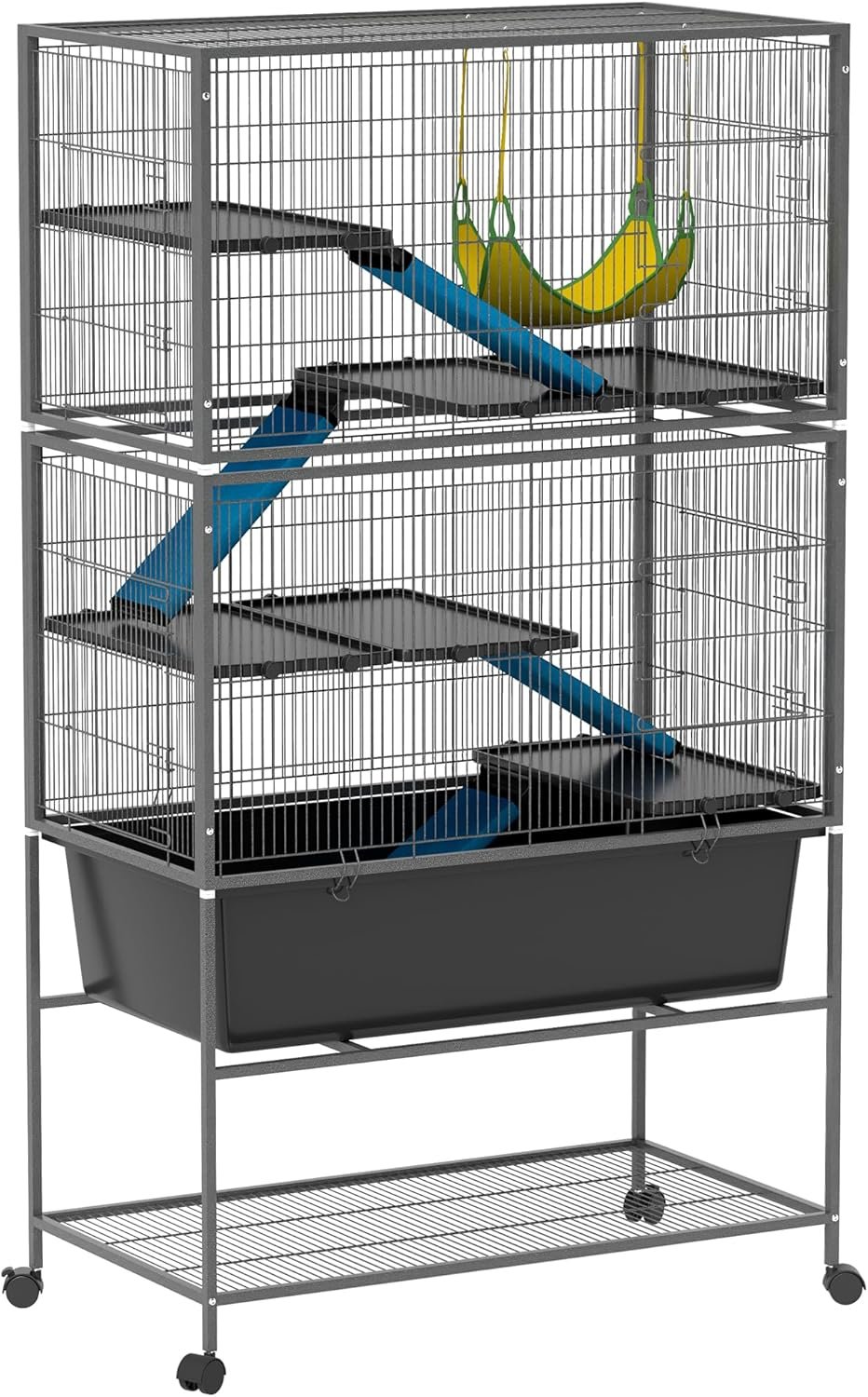 PawHut 59″ 5-Level Small Animal Cage, Rolling Ferret Chinchilla Cage with Slide Out 6.3″ Deep Tray, Non-Slip Cloth Covered Ramps, Hammock, for Rabbits, Pet Mink, Squirrel, Dark Gray