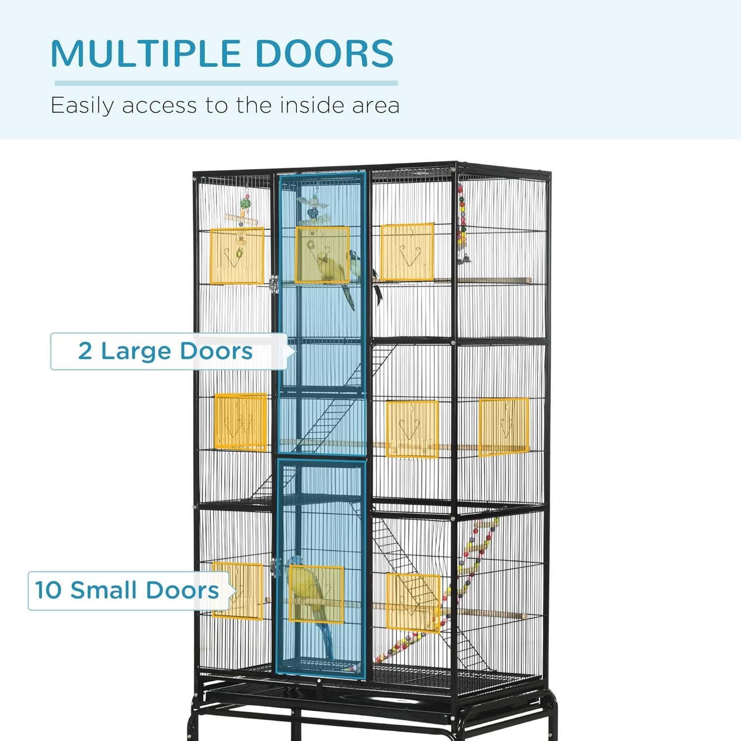 Owner-Friendly Design: Two large doors and ten small doors, so you can easily access and maintain the large bird cage and interact with the birds. Removable tray at the bottom for quick cleaning, keeping their space tidy. The bottom shelf provides a convenient place to store pet supplies.