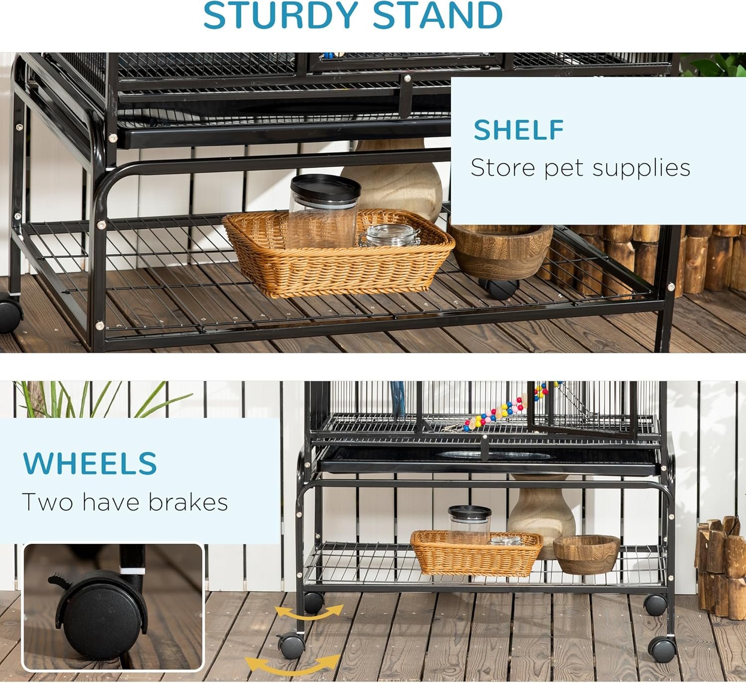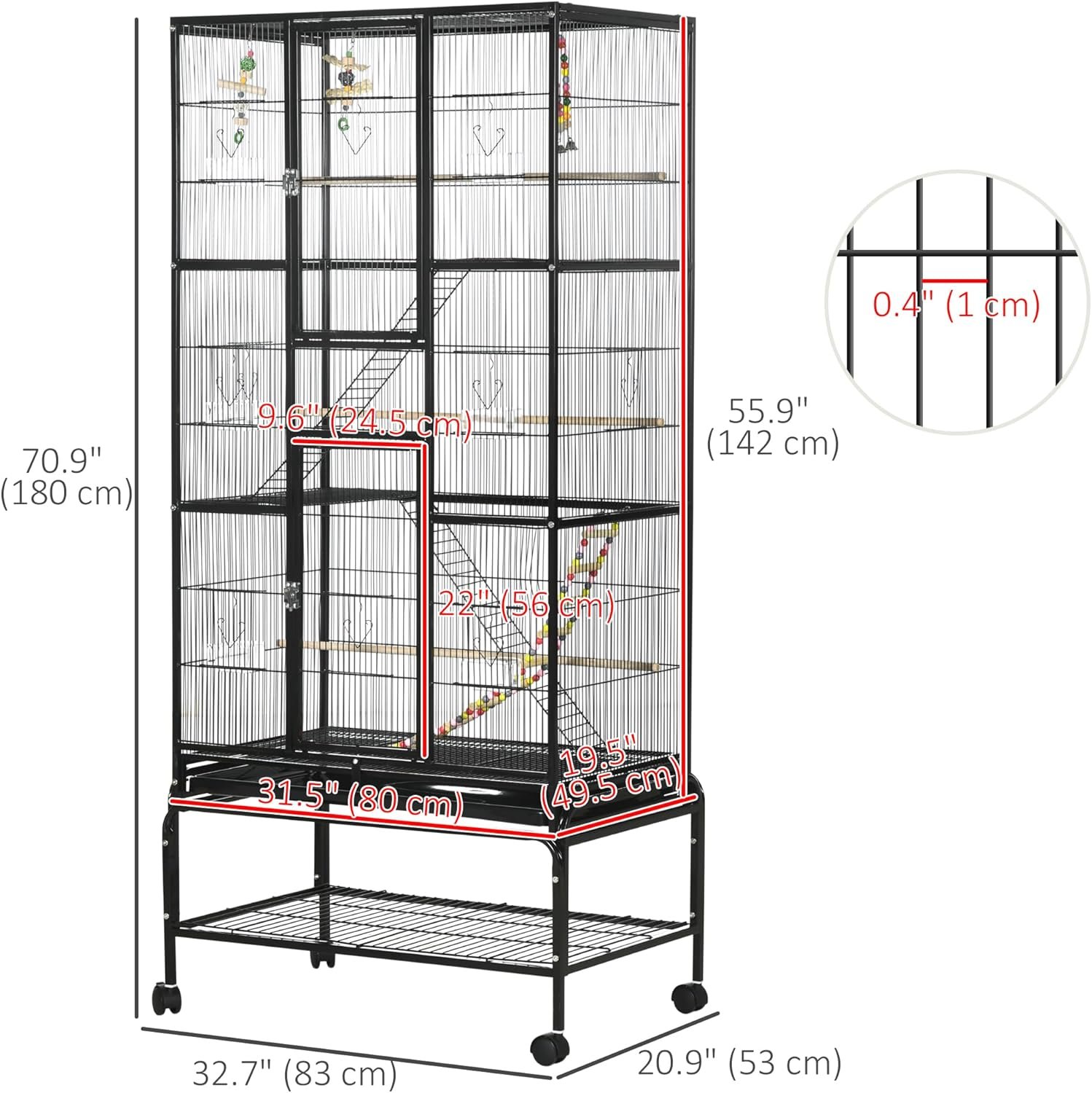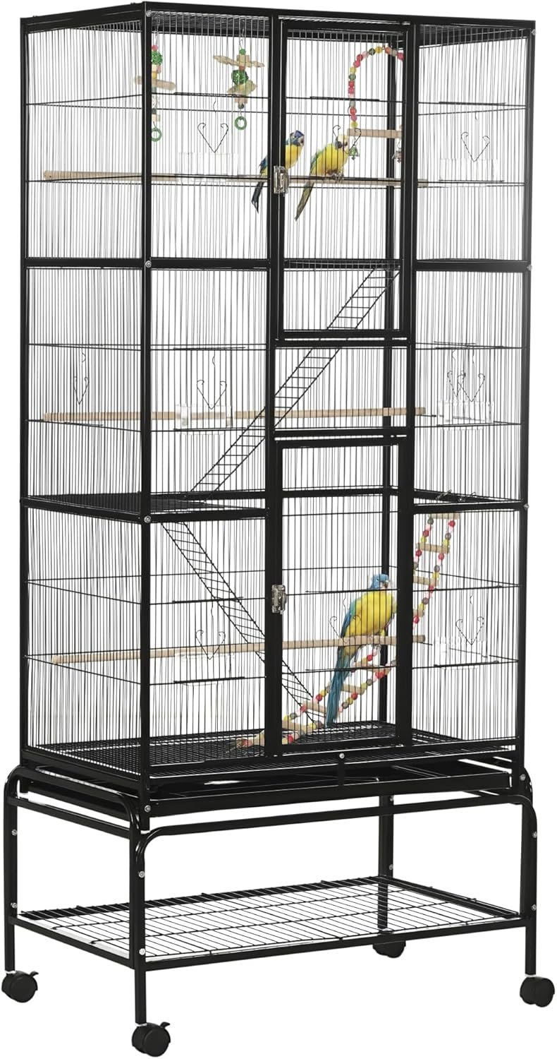 PawHut 71″ Bird Cage, 3 Tier Large Parrot Cage with Wheels, Perches, Ramp, Storage Shelf, Toys for Canaries, Finches, Cockatiels, Parakeets, Black