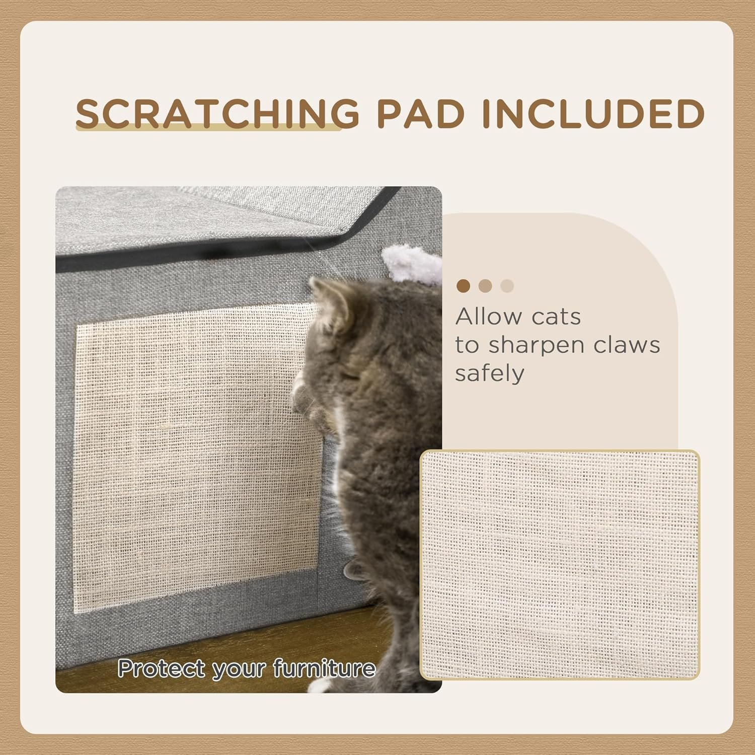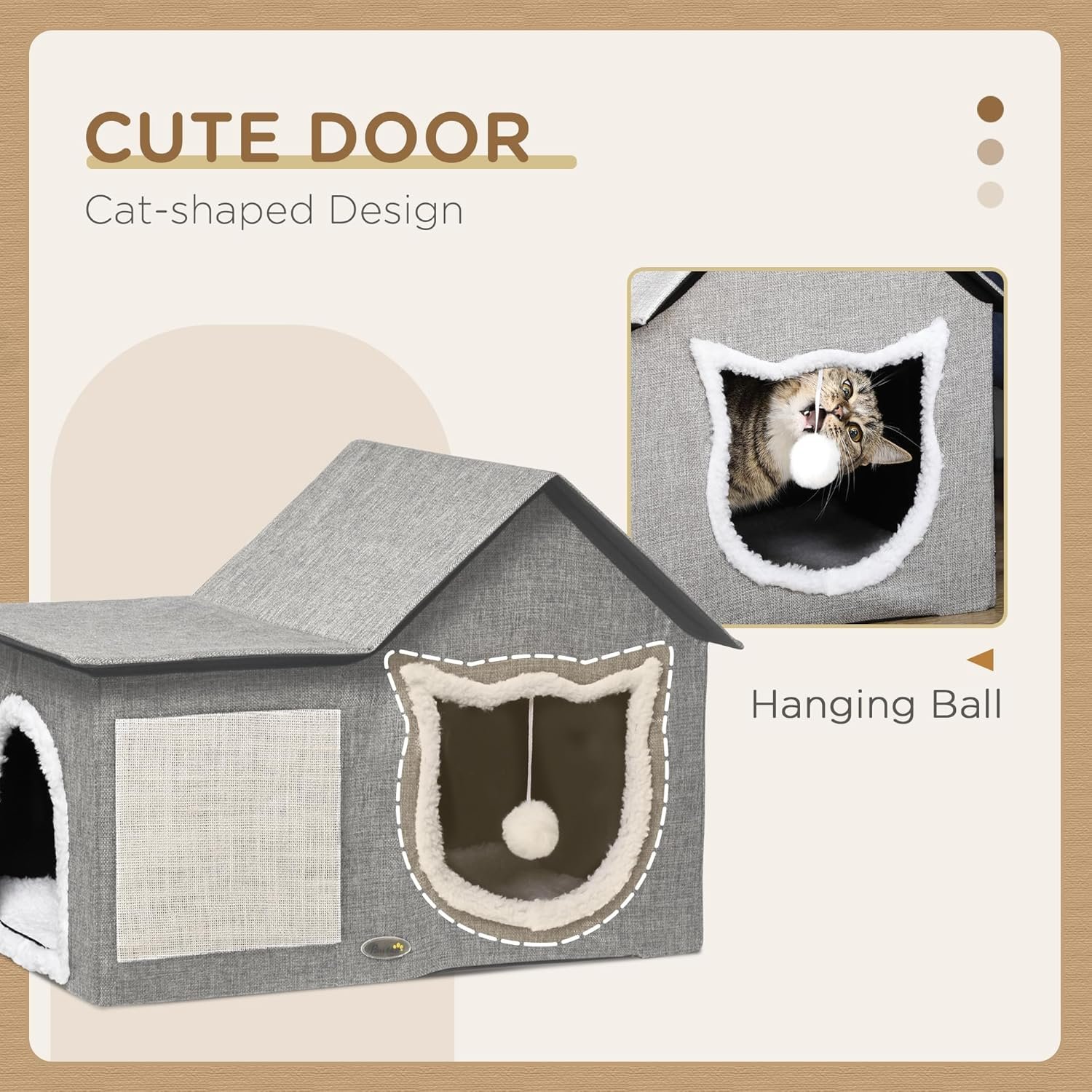 PawHut Large Cat House Cave for Indoor, Covered Cat Bed with Soft Cushion, Scratching Pad, Dangling Ball, Kitten Condo Hideaway with Dual Entrances, Grey