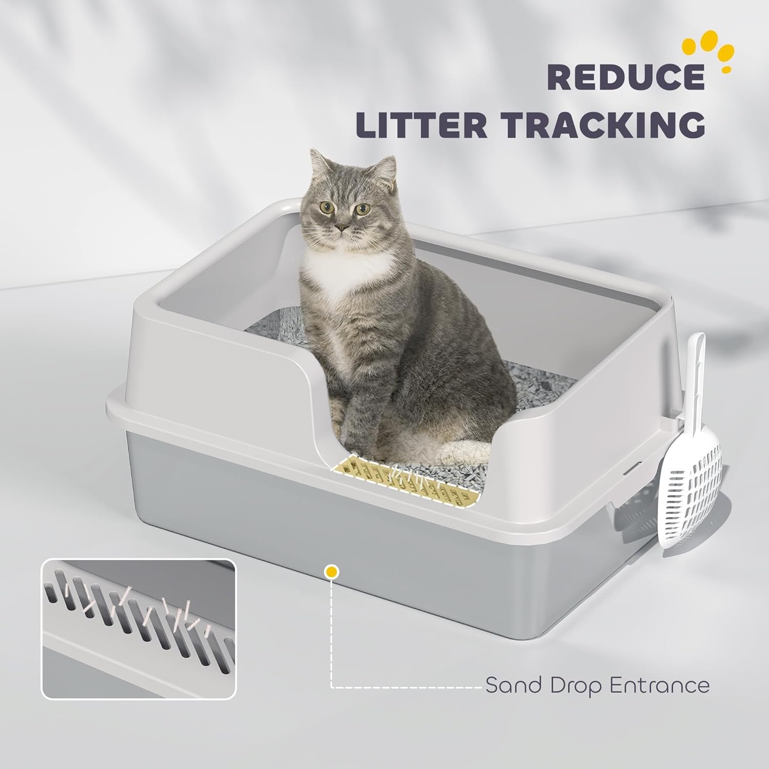 Less Mess: The 5.1″ raised sides effectively prevent litter from spilling, keeping your floors clean, while the sand drop area helps trap excess litter as your cat exits