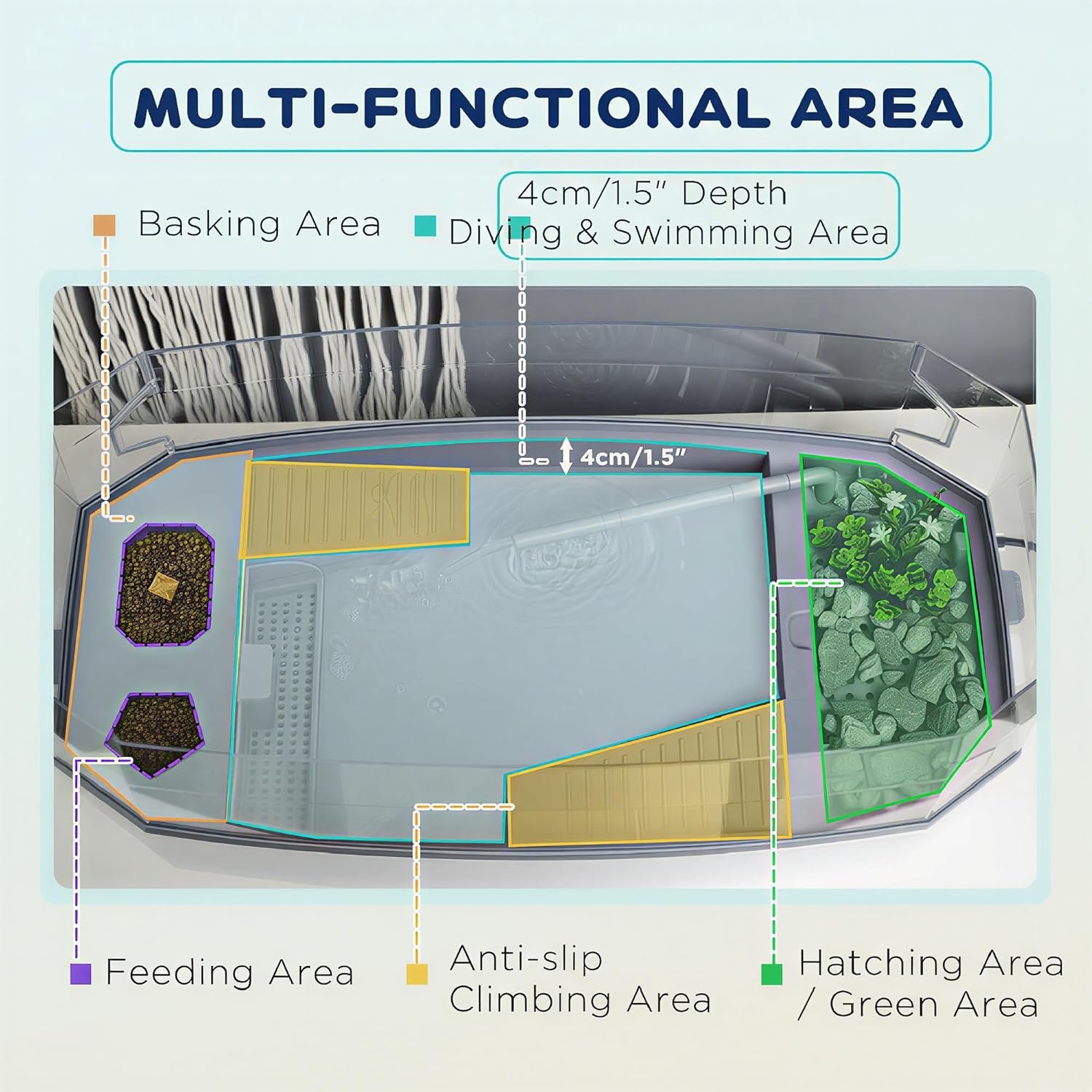 Create an aquatic oasis for your turtle with the PawHut spacious tank. Designed with feeding, basking, climbing, swimming, and hatching areas, it meets every need of your pet. The easy-to-clean design ensures a healthy, stress-free space for your tortoise. Upgrade their home today and let them thrive in comfort and style!
