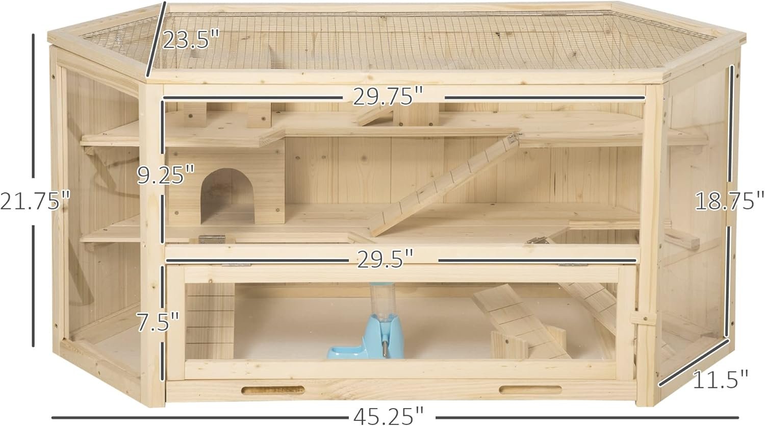 CLEAR VISIBILITY: The big hamster cage is built to offer a clear view from the sides and front, allowing multiple angles of visibility. From each half of the room, your pet can be seen, spot your little guy catch a drink with the water bottle after fun.