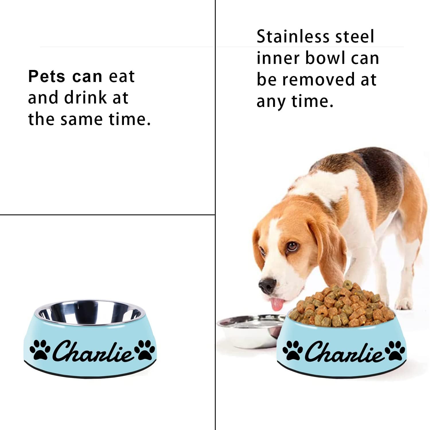 Personalized pet bowl: Create an outstanding design for your customized pet bowl! First click the “Customize Now” button, select the size and pattern of the bowl you need, then select the font and font color, and then edit your pet name to get a high-quality personalized pet bowl.