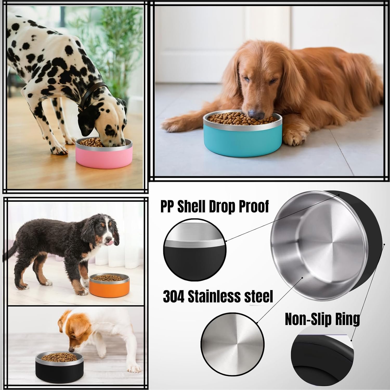 The bowl has a double 304 stainless steel layer for durability, with a PP shell for insulation and drop resistance.The stainless steel pet bowl features a non-slip ring that prevents sliding and protects floors from scratches.