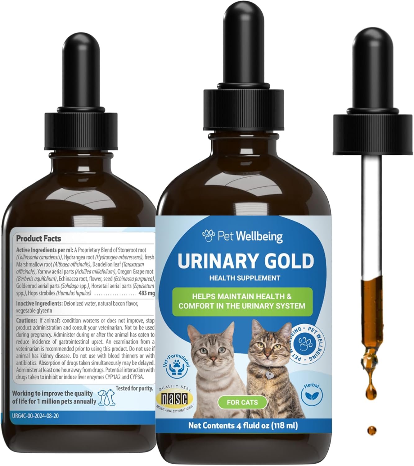 Pet Wellbeing’s Urinary Gold is a veterinarian-formulated blend of nine carefully selected herbs designed to support your cat’s urinary tract health. This gentle formula helps maintain the regular, healthy flow of urine through the kidneys and bladder, helping promote comfort and resilience in the urinary system. Urinary Gold offers powerful, calm support to the delicate tissues of the urethra and bladder, helping to maintain normal urinary frequency and a balanced urinary pH, which is essential for a healthy urinary environment.