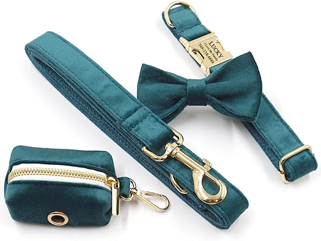 You can choose the color between black, brown, camel, green, grey, mint green, mint blue, mint pink, cream, pink, christmas green, champagne pink, yellow, red, ginger, purple, light purple, pink purple, dark blue, sky blue, light blue and gem green velvet.And you can choose the metal buckle color between gold, rose gold and bright gold.The nice looking of our dog collar with matching dog leash, bow tie, poop bag holder and dog harness set will make your dogs look more handsome, beautiful and stylish.