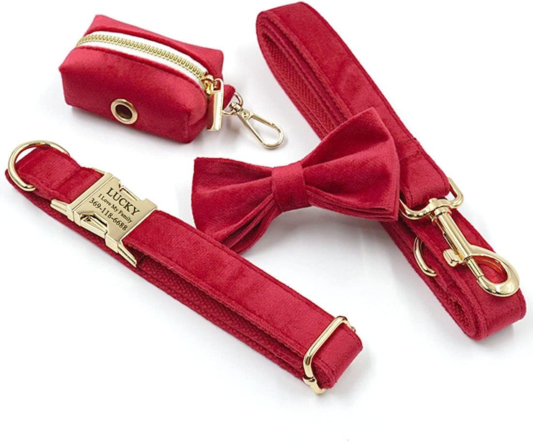 PETDURO Custom Dog Collar Personalized with Name Engraved Gold Metal Buckle for Large Medium Small Female Girl Dogs – Dog Leash and Bow Tie Set Available – Soft Comfy Velvet (Red, M)