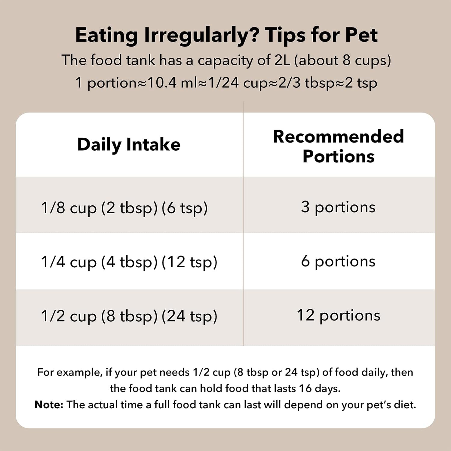 Automatic Feeding Schedule: Tired of your pet stealing food? The PETLIBRO automatic cat feeder supports up to 6 meals per day, with 1-16 portions of food per meal. Easily set the feeding schedule that suits your pet’s needs, helping to establish regular and healthy eating habits. (1 portion ≈ 10.4ml ≈ 1/24 cup ≈ 2/3 tbsp ≈ 2 tsp; food portions may vary based on size and type.)