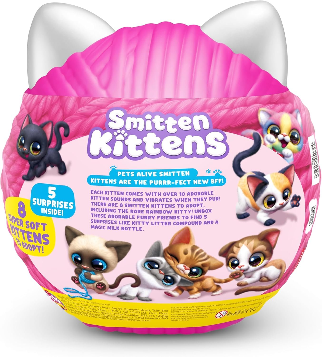These kittens are your next purr-fect pal! Feed your hungry kitten using their milk bottle and hear them purr. Adopt all 8 kittens, including the ultra rare Rainbow Kitty! Unbox 5 surprises, including kitty litter compound. These adorable kittens make over 10 real life kitten sounds and their eyes glow in the dark! They can’t wait to meet you!