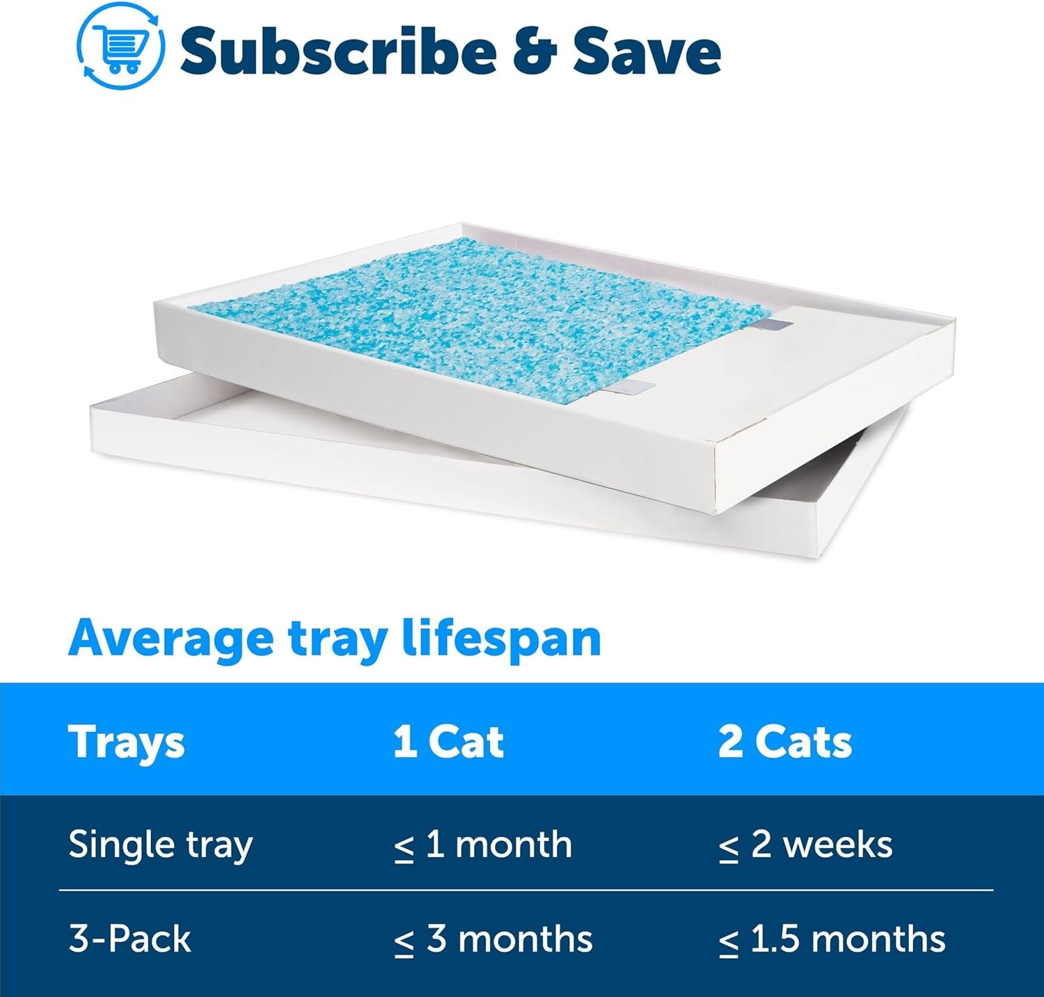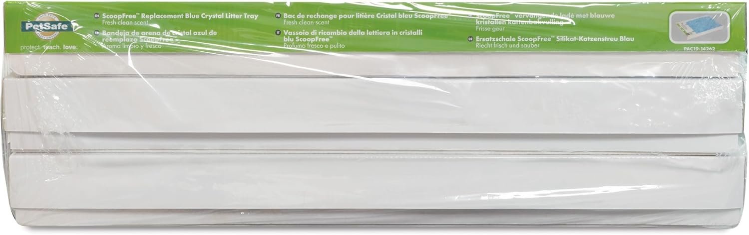 Each tray is pre-filled with premium blue crystal cat litter, the disposable PetSafe ScoopFree Original Crystal Cat Litter Tray works with PetSafe ScoopFree Self-Cleaning Cat Litter Boxes. Just load the tray in the cat litter box with no scooping, cleaning or refilling for weeks! The crystal cat litter absorbs urine and dries solid waste quickly to remove odors. With the completely disposable tray and covered waste trap, you never see or touch smelly waste! Every few weeks simply replace the cat litter tray and your ScoopFree Self-Cleaning Cat Litter Box is just like new. PetSafe brand is here to help you and your pet live happy together.