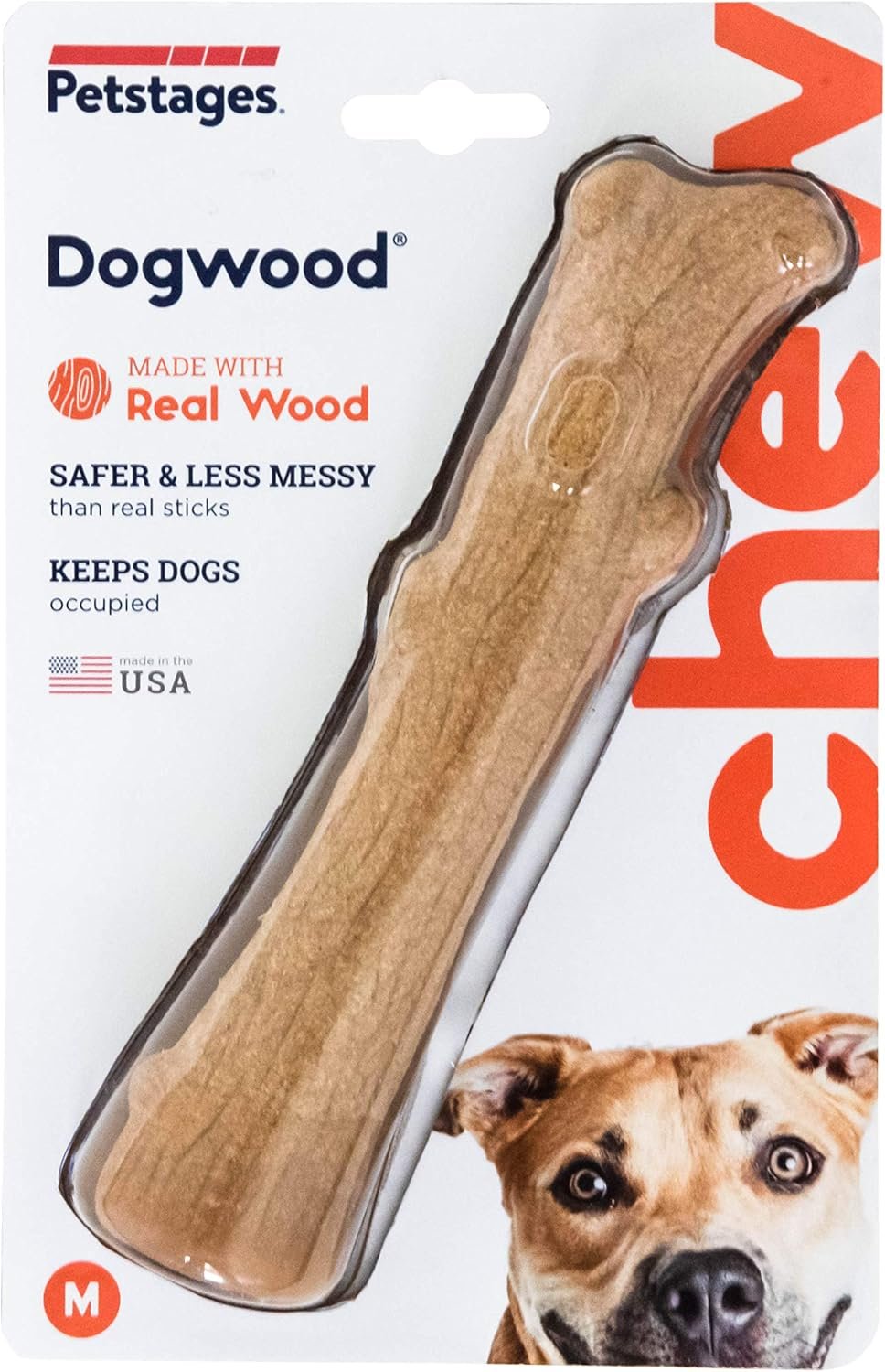 DURABLE ALTERNATIVE WOOD CHEW TOY: Petstages Dogwood chew stick is made in the U.S.A. from a blend of natural wood fiber and safer synthetic materials to mimic the texture and taste of real wood that your dog will love.