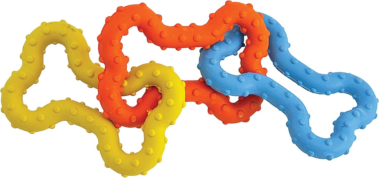 The Petstages Mini Bone Tug Puppy chew toy is a floppy and fun take on a traditional chew toy. This multicolored chew toy is made of three interlocking rubber bones that feature a ridge texture that massages your puppy’s gums as they chew. The pliable rubber material makes this chew toy great for games of tug-of-war as well toss and fetch. Cleans easily with warm soap and water. SAFETY AND CARE: Petstages chews are non-edible and are meant for dogs only. As with any chew toy, we always recommend monitoring your dog’s use and replacing after reasonable wear, no toy is indestructible. Remove if excessive consumption occurs or pieces larger than a piece of rice are chewed off. Know your dog’s chewing habits and teeth strength, your pet’s safety is your responsibility. For additional safety information, please visit our Petstages safety page to review our suggested 10 Chew Commandments.