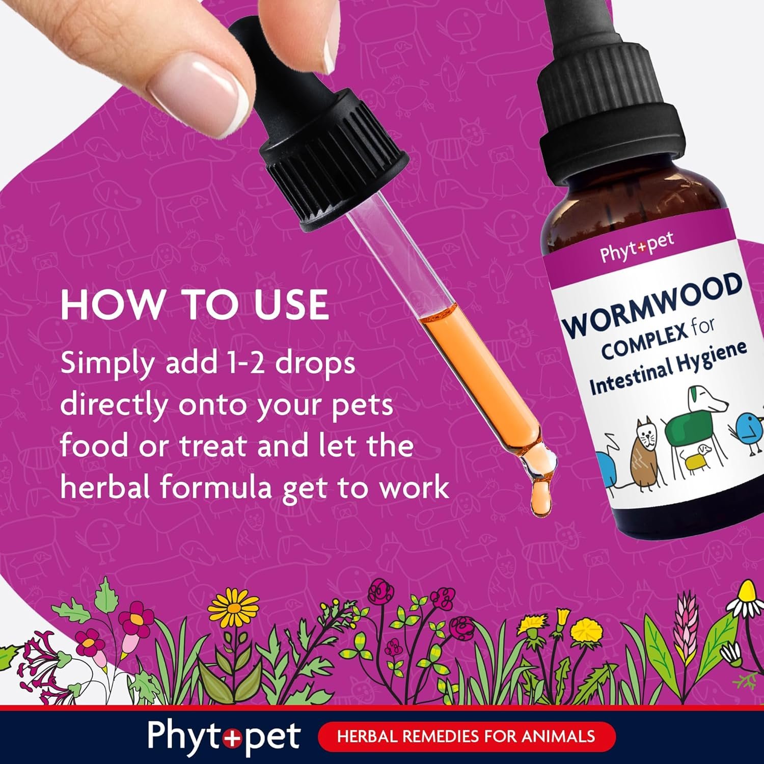 Phytopet Wormwood Complex is herbal control for your pets intestinal hygiene Gentle non toxic. Use regularly to help maintain gut hygiene. Liquid botanical extracts. Easy to administer, just add to water, food or treat, no fighting to give tablets. A combination of herbs traditionally used to help control and maintain gut hygiene.