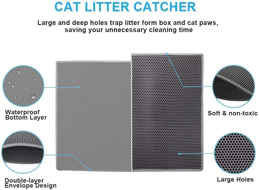 Anti Tracking EZ Open Edge Litter Mat: Double-layer honeycomb design helps you gather the litter. You just pick up the mat and all the litter falls through and then dump it back in the litter box make it recycling. No more getting litter stuck to my feet on a daily basis! Large holes is large enough to catch and trap litter. Suitable for lots of type of litter, and kitty litter boxes,hooded,self cleaning litter box.