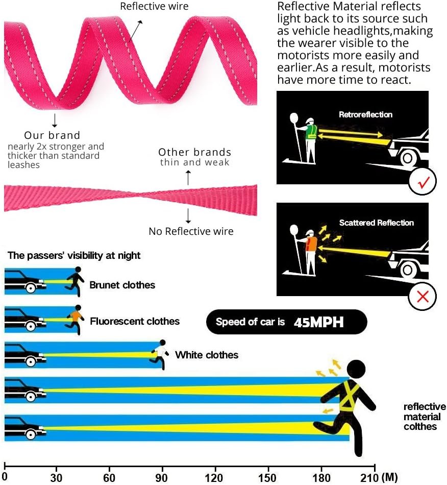 Our dog leash features 2 handles, one at the end of the leash at 6ft and another at 1ft from the clip. The long one is perfect for casual walks, extended sniffing and loose leash walking, the shorter one is great for busy sidewalks, bike paths and crowded areas that require that you have instant, up-close control of your dog. Can be used as a Training aid to control Dominance and Aggression. The leash has two fully-padded neoprene handles, which are much more comfortable than normal leash handles and will prevent redness, chafing, or blistering on your hands. The entire leash is stitched on both sides with reflective 2mm wide stitching to increase your visibility at night and for added safety for you and your dog.
