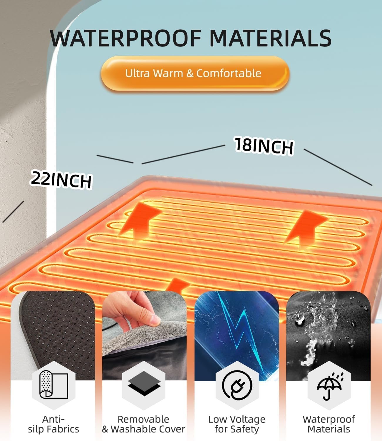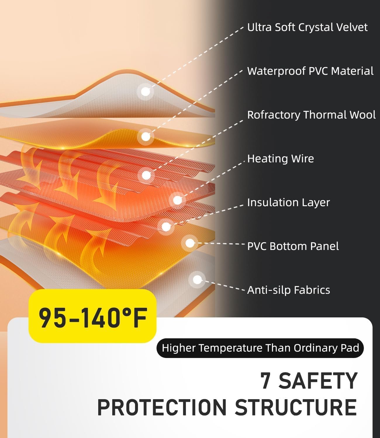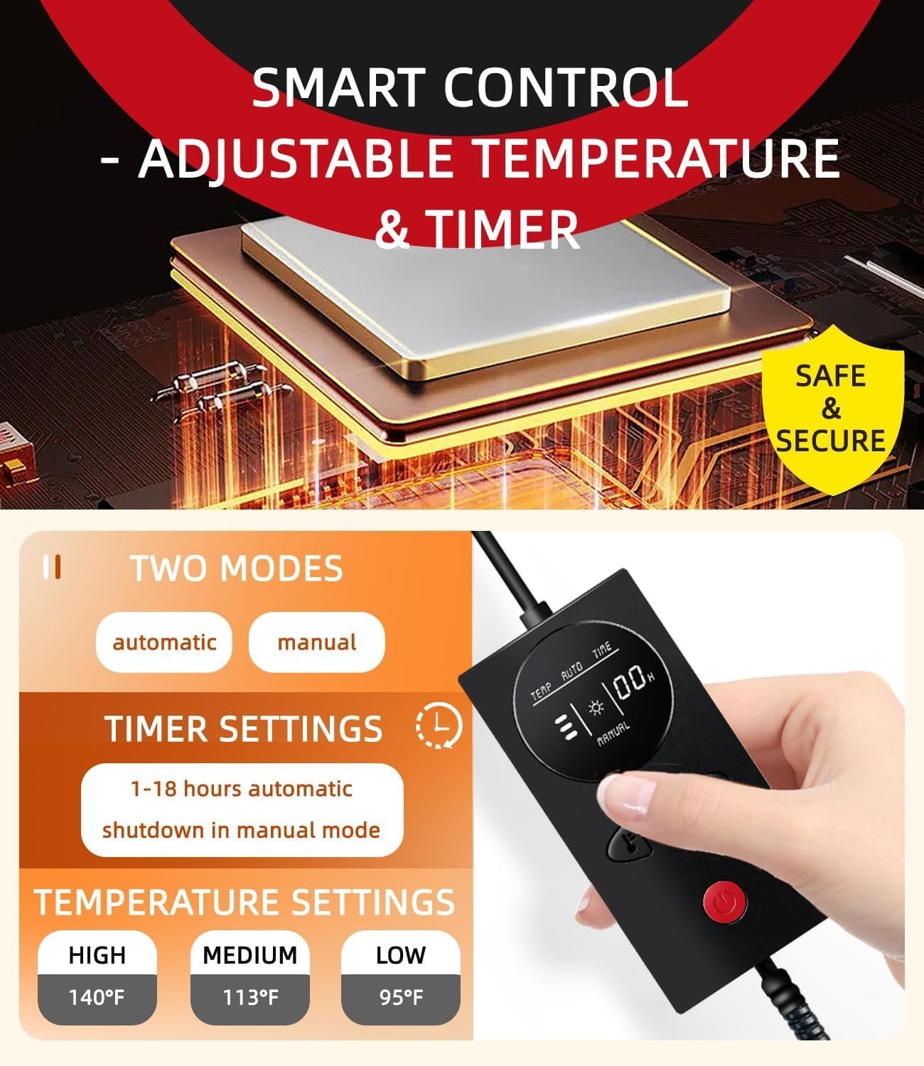 【Rapid Heating & Advanced Safety】 Heats up swiftly in 5 minutes, offering a temperature range of 35℃-60℃ (95℉-140℉) in both Automatic and Manual Modes. Equipped with an overheat protection sensor to maintain a safe temperature. Safety features include a low-voltage plug and chew-resistant wire cover.
