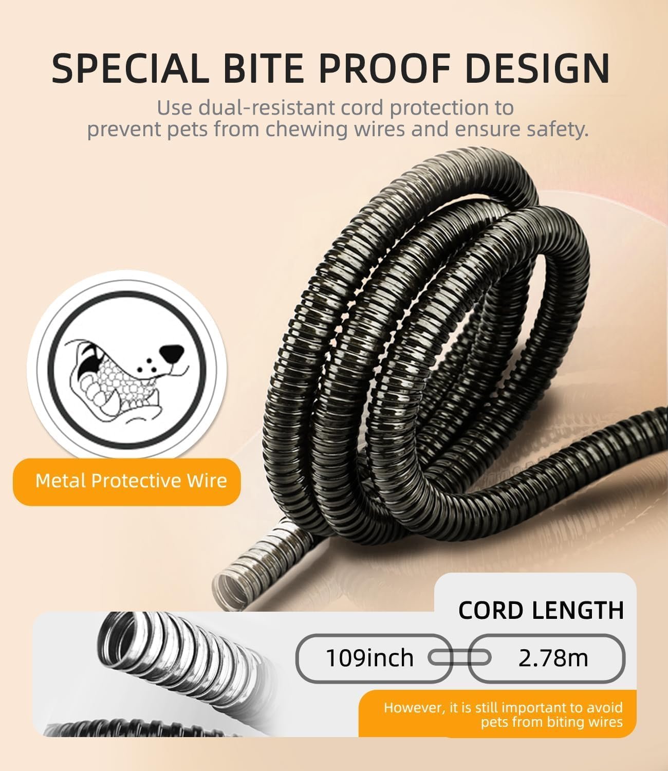 For added pet safety, the power cord is wrapped in a steel sleeve to protect pets from biting the cord and electrocuting themselves.