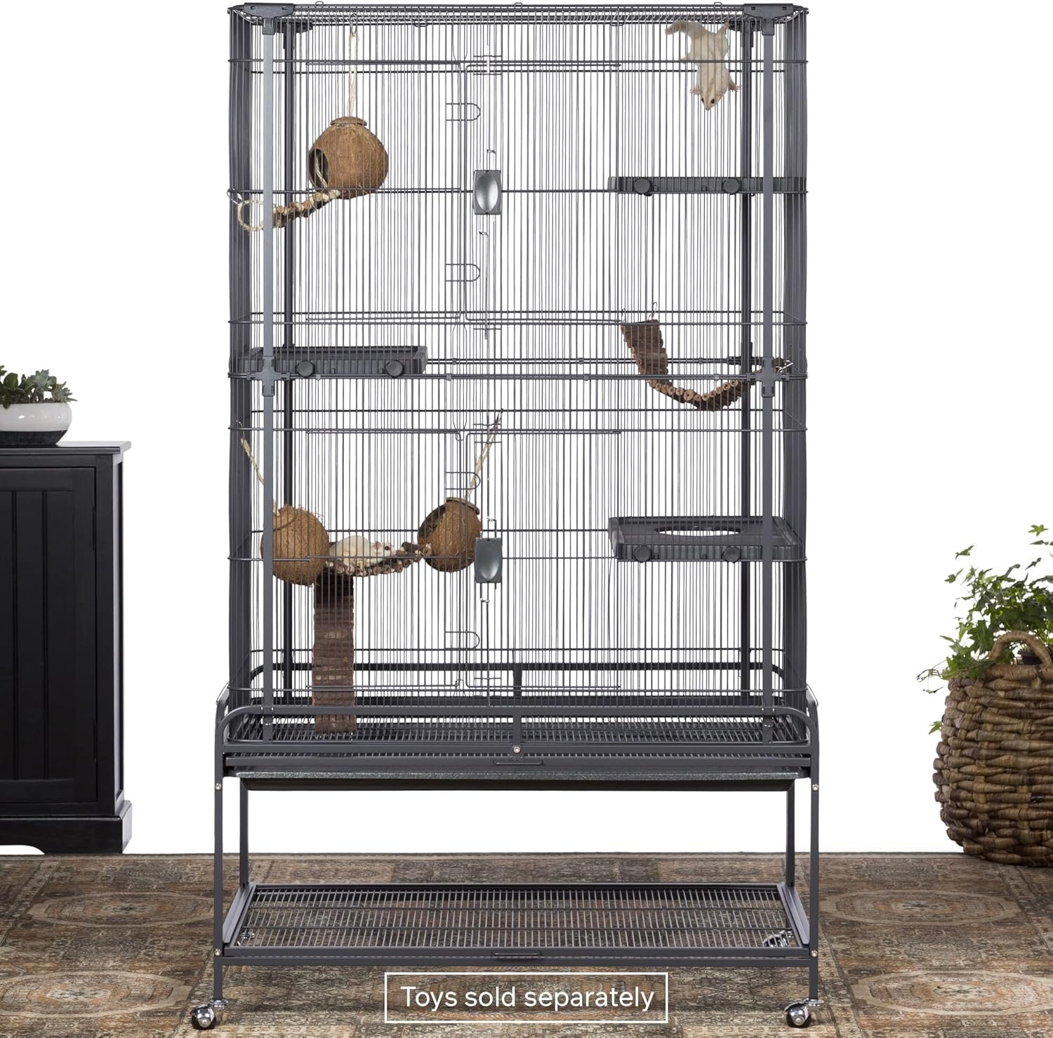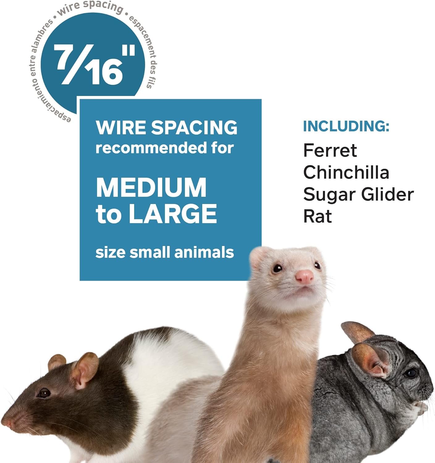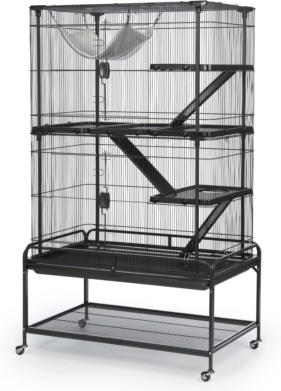 Prevue Pet Products Deluxe Critter Cage 484 is a safe and spacious home for a wide variety of small animals. Exceptional engineering makes our critter cage easy to assemble and provides a paw friendly design – no gaps or pinch points. Lightweight, rust-resistant, aluminum channel construction is heavy duty with rails, clips and alignment tabs to keep cage parts aligned, strong and sturdy. Cage comes complete with five shelves with twist knob closure, three ramps and a super soft plush hammock. Pet parents can comfortably access the cage interior through two large entry points, cage doors close easily and securely with our simple two-finger locking mechanism. Doors swing open wide providing full interior cage access for interacting with your pet or cleaning. The removable grille and tray make this cage easy to clean and are held in place with a windbell lock. A solid fit into the cage base provides extra stability while metal and hard rubber casters allow you to easily move the cage and lock into place as needed. Use the built in shelf to store extra toys or treats. Expertly engineered in the USA, all Prevue cages undergo independent lab testing to conform to the highest levels of pet safety. Suitable for small animals, ferrets, sugar gliders, rats, chinchillas, hedgehogs, tortoises, lizards, chameleons, iguanas and more, our Deluxe Critter Cage measures 37’’ long, 23 1/8’’ wide and 63 3/8’’ high (including the stand) with 7/16’’ wire spacing. Replacement platforms and ramps available separately.