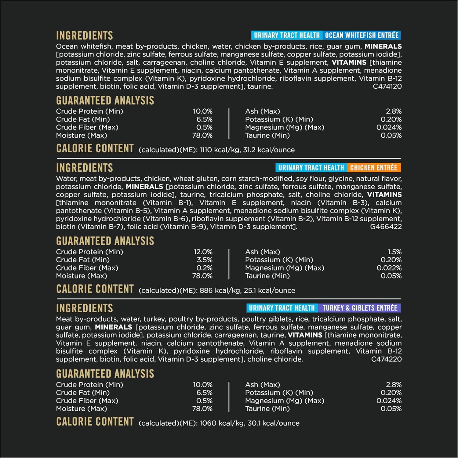Offer your cat the extra care she needs with this Purina Pro Plan Focus Urinary Tract Health Formula adult wet cat food. Three distinct recipes give you a way to make mealtime interesting, and each recipe is made with real fish or poultry plus other high-quality ingredients. This wet cat food is formulated to help maintain your cat’s urinary tract health by reducing urinary pH and providing low dietary magnesium. With 25 essential vitamins and minerals plus taurine, this wet cat food helps to support your feline friend’s overall health and wellness. She gets extra-care nutrition for her specific needs and great taste in every bowlful, and you get the peace of mind that comes from feeding her meals backed by a trusted brand. For the quality and convenience you love, buy Purina Pro Plan Focus Urinary Tract Health Formula adult wet cat food.