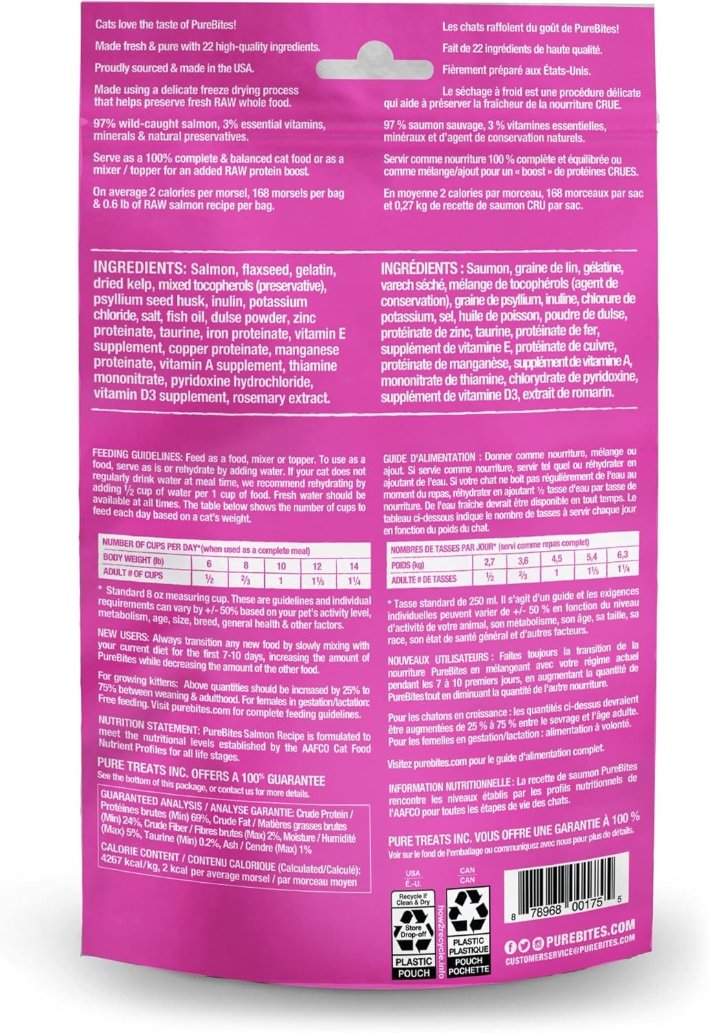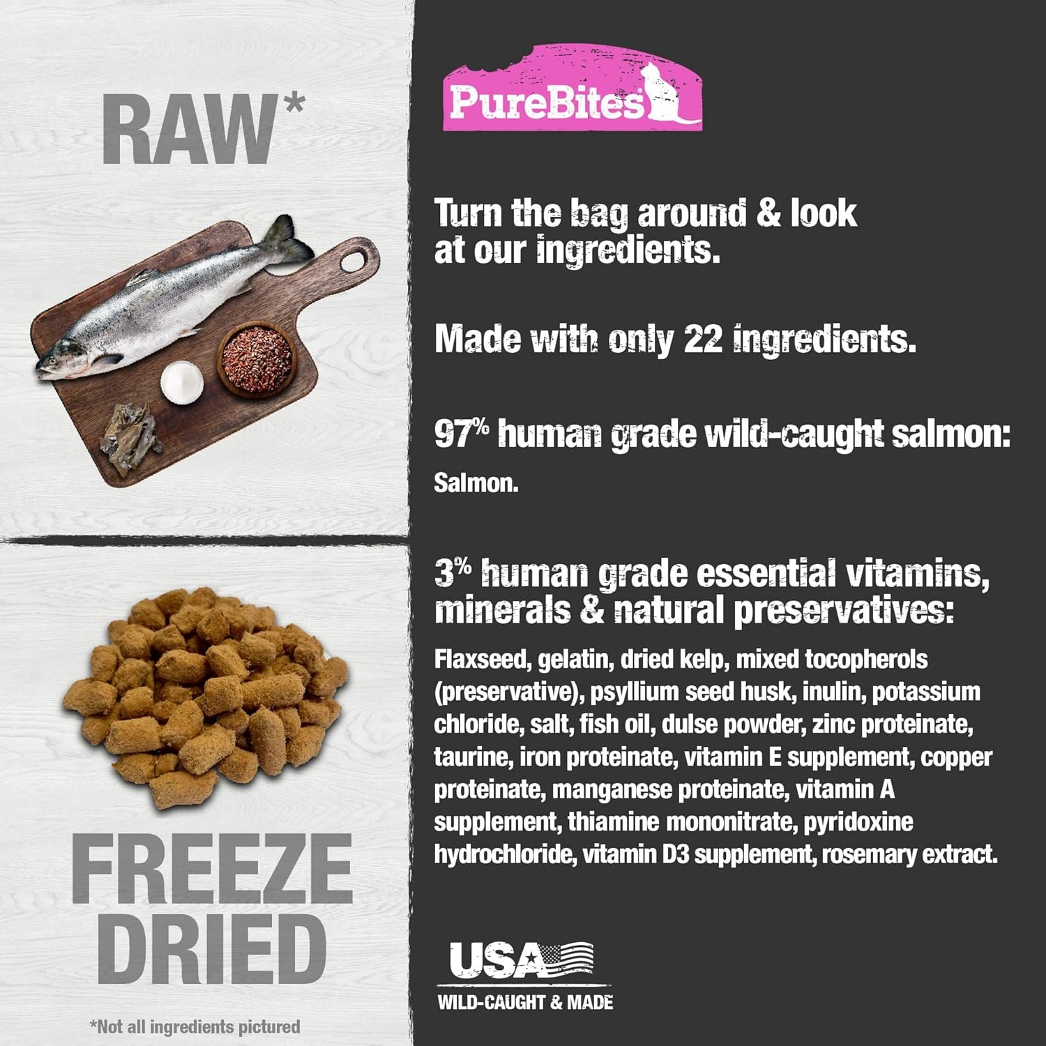 Go ahead, look at our ingredients; made with only 22 simple human grade ingredients: 97% pure wild-caught salmon and 3% essential vitamins, minerals, & natural preservatives; PureBites salmon recipe is sourced and freeze dried in the USA, then packaged and perfected in our very own Canadian kitchen; it can be fed as a complete & balanced food, mixer, or topper for your cat