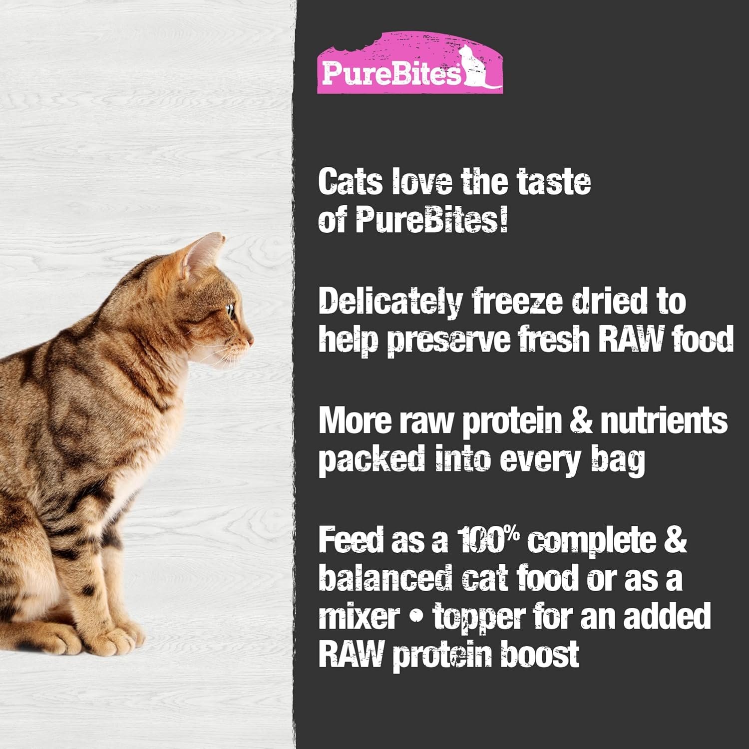 Cats love the taste of PureBites! 100% natural, high in protein, low in calories (only 2 calories per average morsel) and nothing added like colours, fillers, or sweeteners