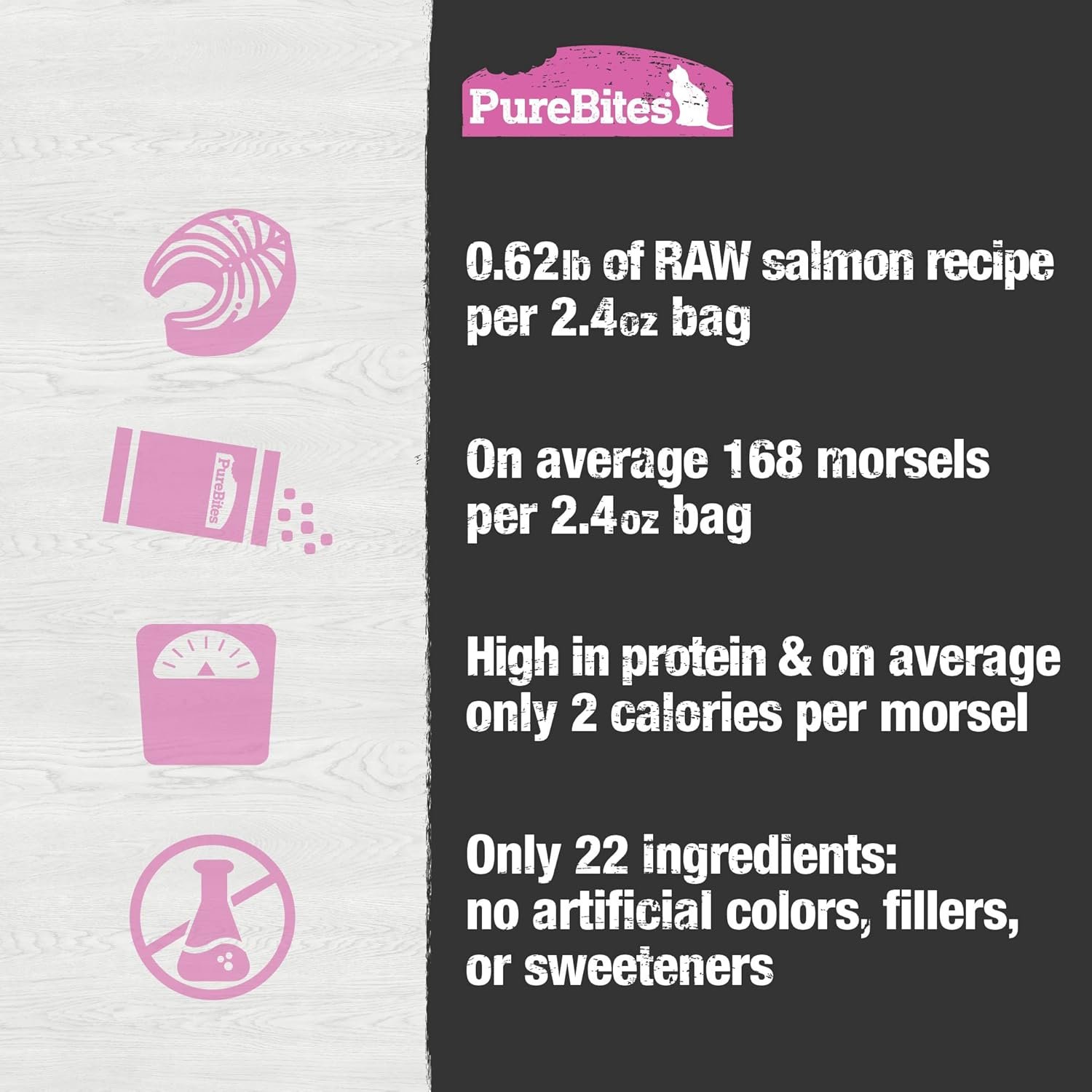 PureBites is a proudly Canadian company treating and feeding pets from coast to coast since 2005. Made fresh & pure, using a delicate freeze drying process that helps preserve fresh RAW whole food. With 0.62lb of RAW salmon recipe and 168 morsels per 2.4oz bag, our bags are packed with more protein and nutrients