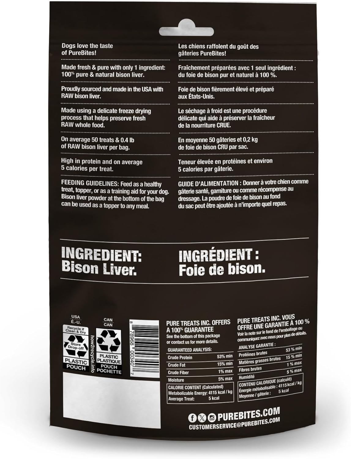 PureBites is a proudly Canadian company treating and feeding pets from coast to coast since 2005. Our bison liver treats are made fresh & pure, using a delicate freeze drying process that helps preserve fresh RAW whole food; with 0.4lb of RAW bison liver and 50 treats per 2.1oz bag, our bags are packed with more protein and nutrients