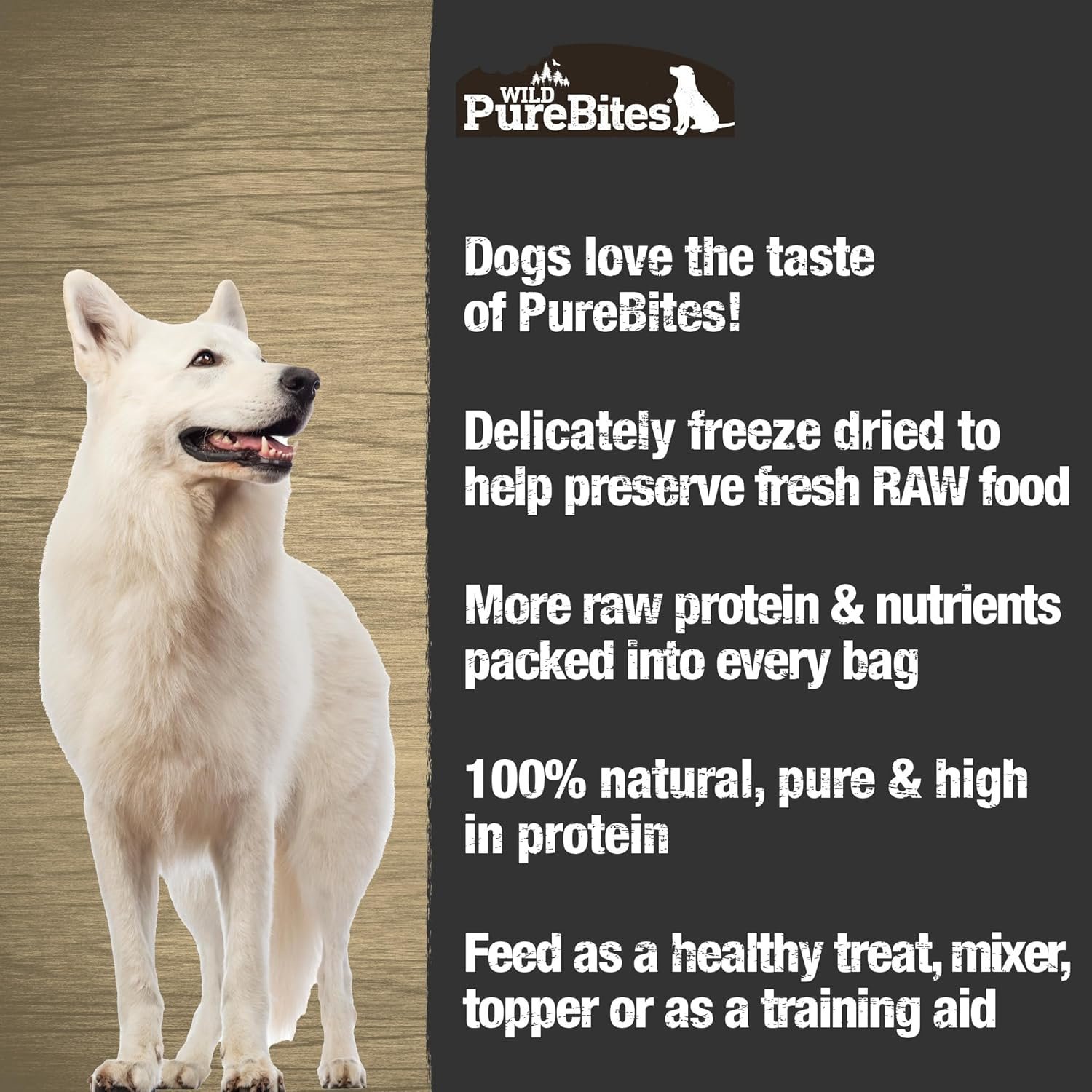 Dogs love the taste of PureBites! 100% natural, high in protein, low in calories (only 5 calories per average treat) and nothing added like colours, fillers, or sweeteners