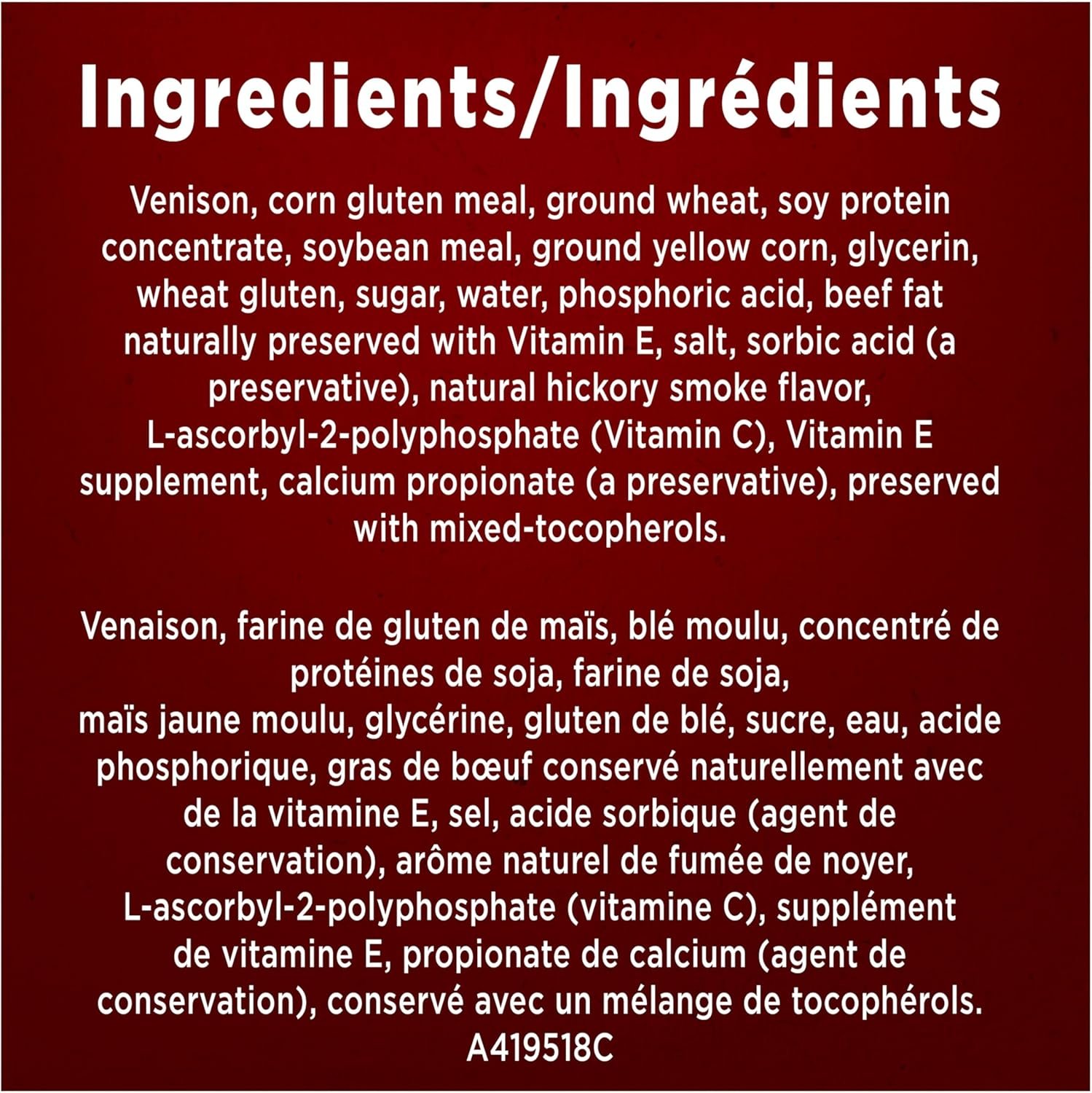 Help your canine satisfy his ancestral cravings with Purina ONE True Instinct natural dog treats with real venison as the #1 ingredient. These meaty dog treats are loaded with protein, so he’s always ready for his next big adventure on the wild side. With less than 2.5 calories each, these tempting Purina ONE dog snacks are an ideal training reward that satisfies your dog’s natural instinct for nutrients while sending a cue that he’s doing a good job. The bite-sized morsels make them easy for dogs of all sizes to manage. Our natural dog treats contain no artificial colours or flavours, so you can be sure that with each reward, your canine tastes nothing but meaty goodness. We make these Purina ONE True Instinct dog treat bites in our North American facilities and conduct regular safety and quality checks. The dog treats come in a resealable pouch to help keep your dog’s snacks fresh.