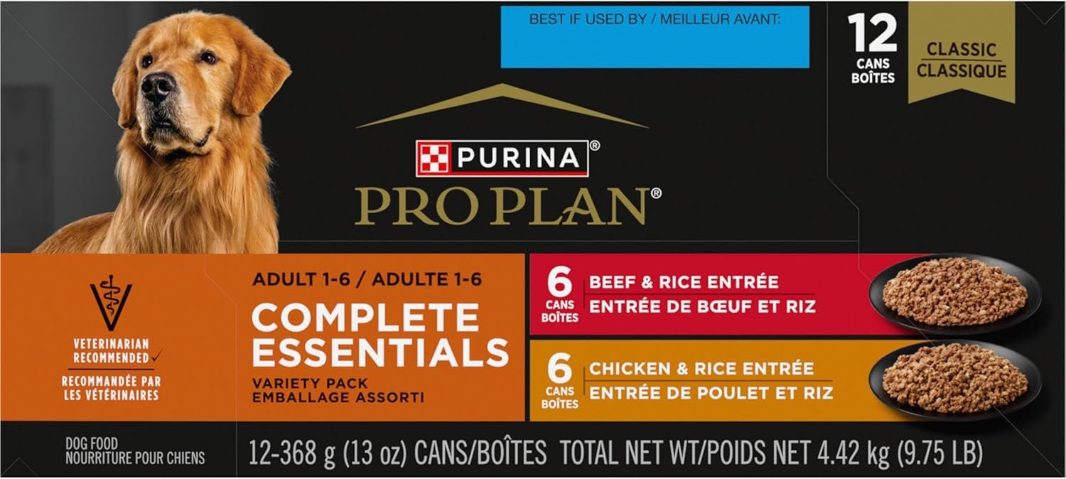 Purina Pro Plan Complete Essentials Wet Dog Food, Entree Variety Pack 2 Flavours – 368 g Can (12 Pack)