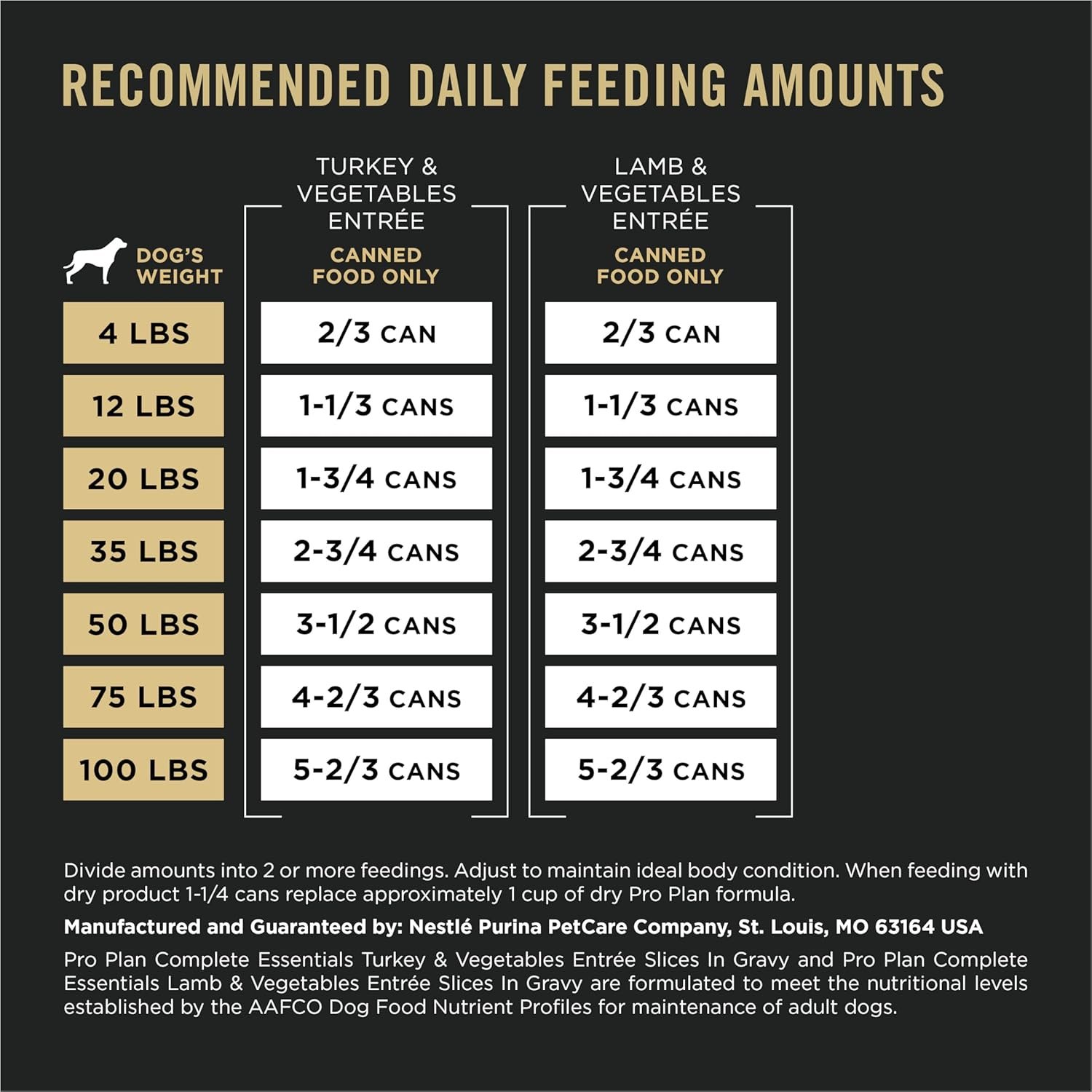 Diversify your dog’s mealtime routine with a Purina Pro Plan Complete Essentials in Gravy Lamb and Vegetables Entree and Turkey and Vegetables Entree High Protein Adult Dog Food 12ct Variety Pack. Featuring two delicious real meat dog food recipes, including slices made with lamb or turkey in mouthwatering dog food gravy, this Purina Pro Plan wet dog food variety pack will get their tail wagging for mealtime. With optimal protein levels, these high protein canned dog food formulas are great for helping dogs maintain an ideal body condition. This Purina Pro Plan dog food is made with vitamins and nutrients to help support a healthy immune system, healthy skin and coat and more. Rest assured that this soft dog food includes no artificial colors, flavors or preservatives. Offer your dog two irresistible adult dog food recipes giving them 100 percent complete and balanced nutrition with a Pro Plan Complete Essentials Lamb and Turkey Slices in Gravy 12ct High Protein Adult Dog Food Variety Pack.
