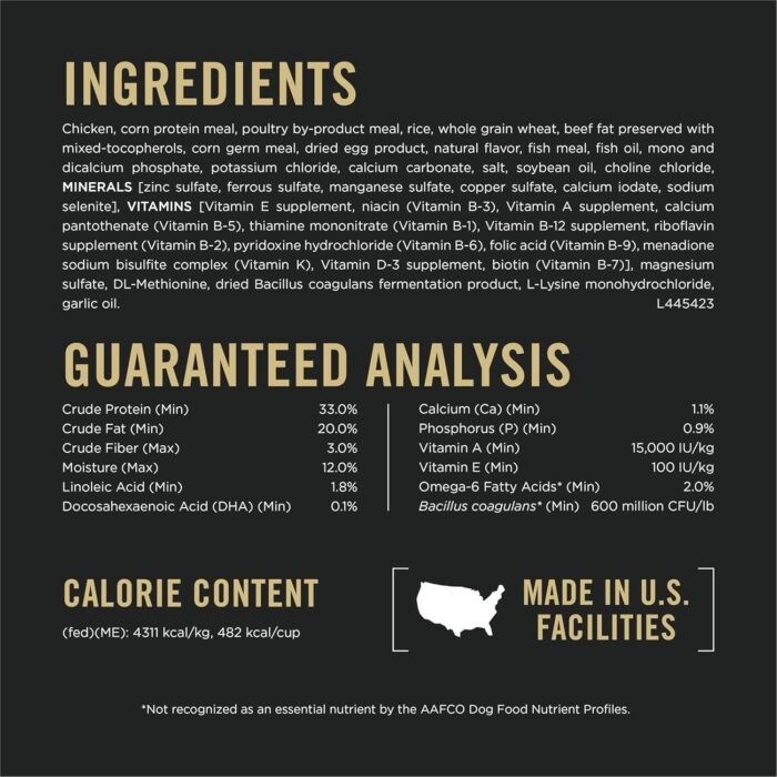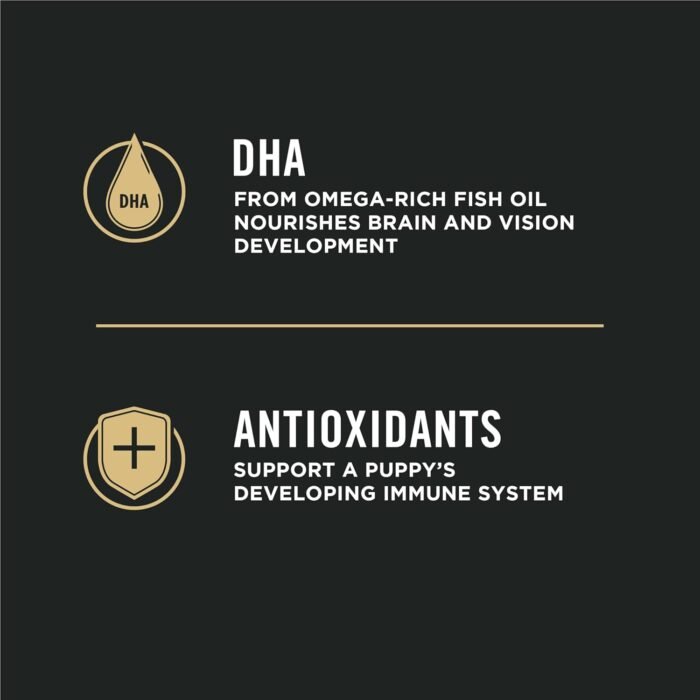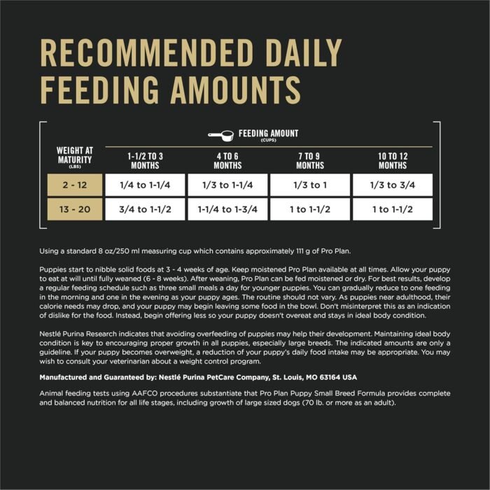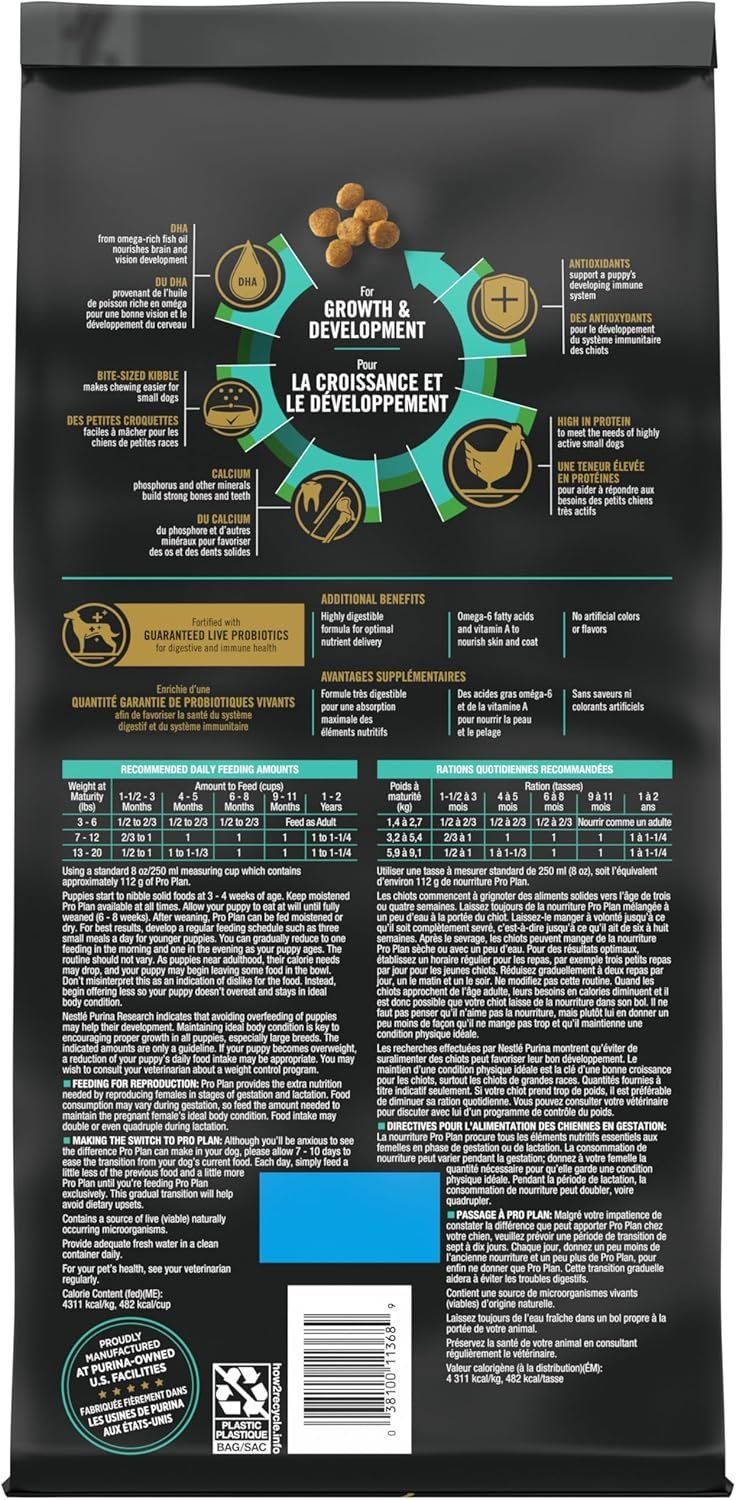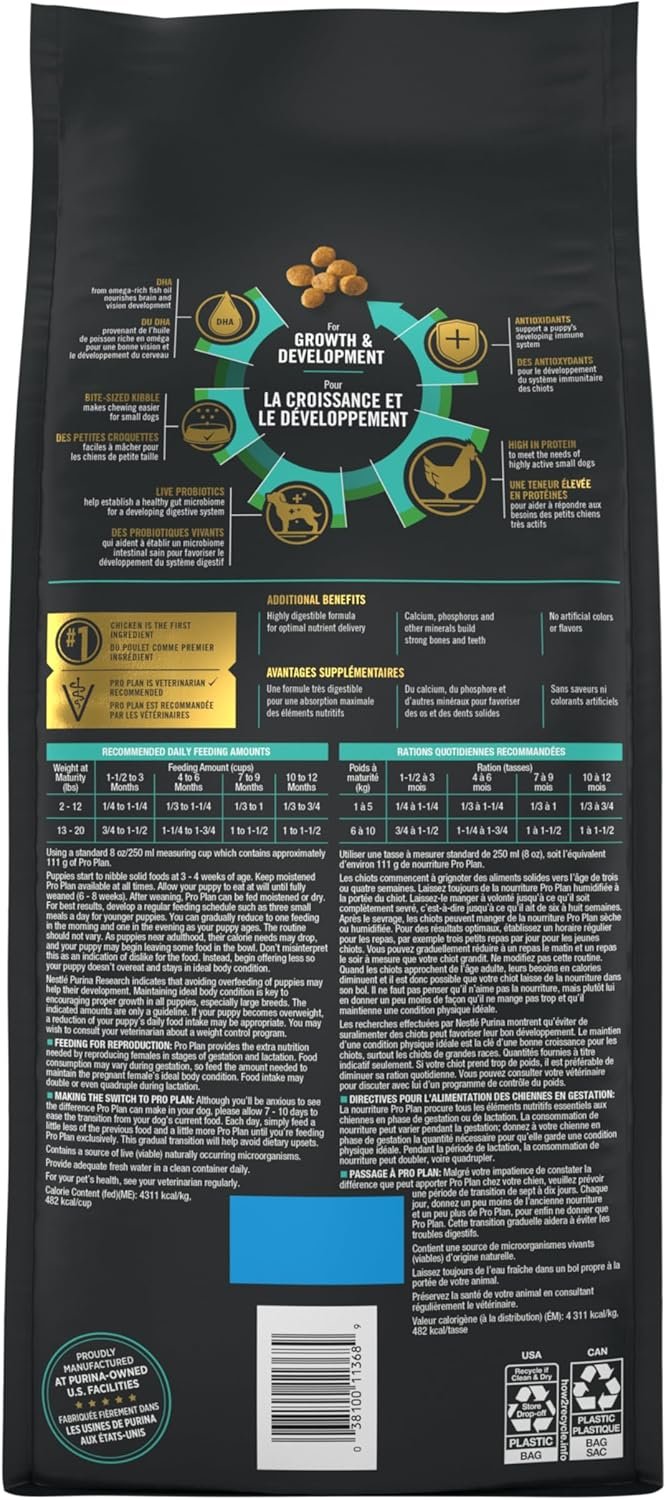 Give your puppy the nutrition he needs to get a great start in life with Purina Pro Plan Brand Dog Food Puppy Small Breed Chicken & Rice Formula dry puppy food. This formula is high in protein, including chicken as the first ingredient, to meet the needs of highly active small dogs. With no artificial colours or flavours, every ingredient is carefully selected for a specific nutritional or functional purpose, giving your puppy specialized nutrition to meet his needs at his current life stage. With its bite-sized kibble, this puppy food helps to make chewing easier for your small dog, and the highly digestible formula promotes nutrient availability and absorption so your puppy can get the most out of every serving. Real poultry in this small breed puppy food helps provide for your dog’s protein needs. Make this super-premium dry puppy food part of your small breed companion’s daily diet, and give him the taste that keeps his belly happy at mealtime.