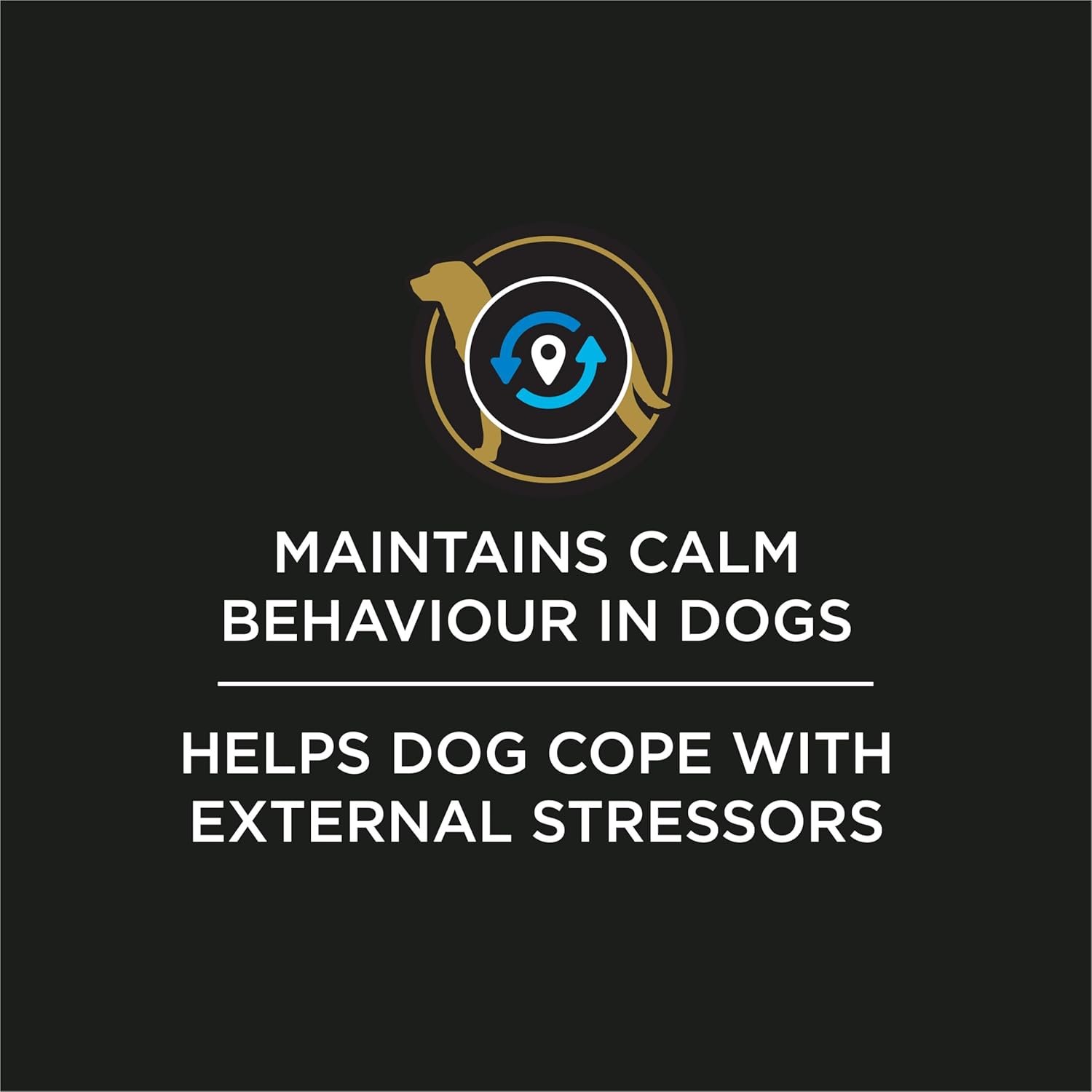Helps dogs cope with external stressors like separation, unfamiliar visitors, novel sounds, or changes in routine and location.