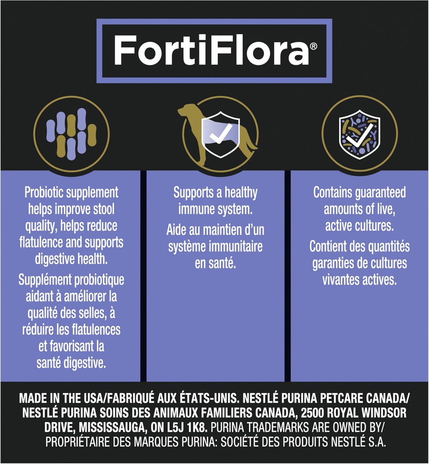 Purina® Pro Plan Veterinary Supplements® FortiFlora® Canine Probiotic Supplement is the #1 recommend probiotic by Veterinarians. It is a probiotic supplement that supports digestive health and helps improve stool quality in dogs. It is a proprietary probiotic supplement that contains guaranteed amounts of live, active cultures of strain Enterococcus faecium SF68®.