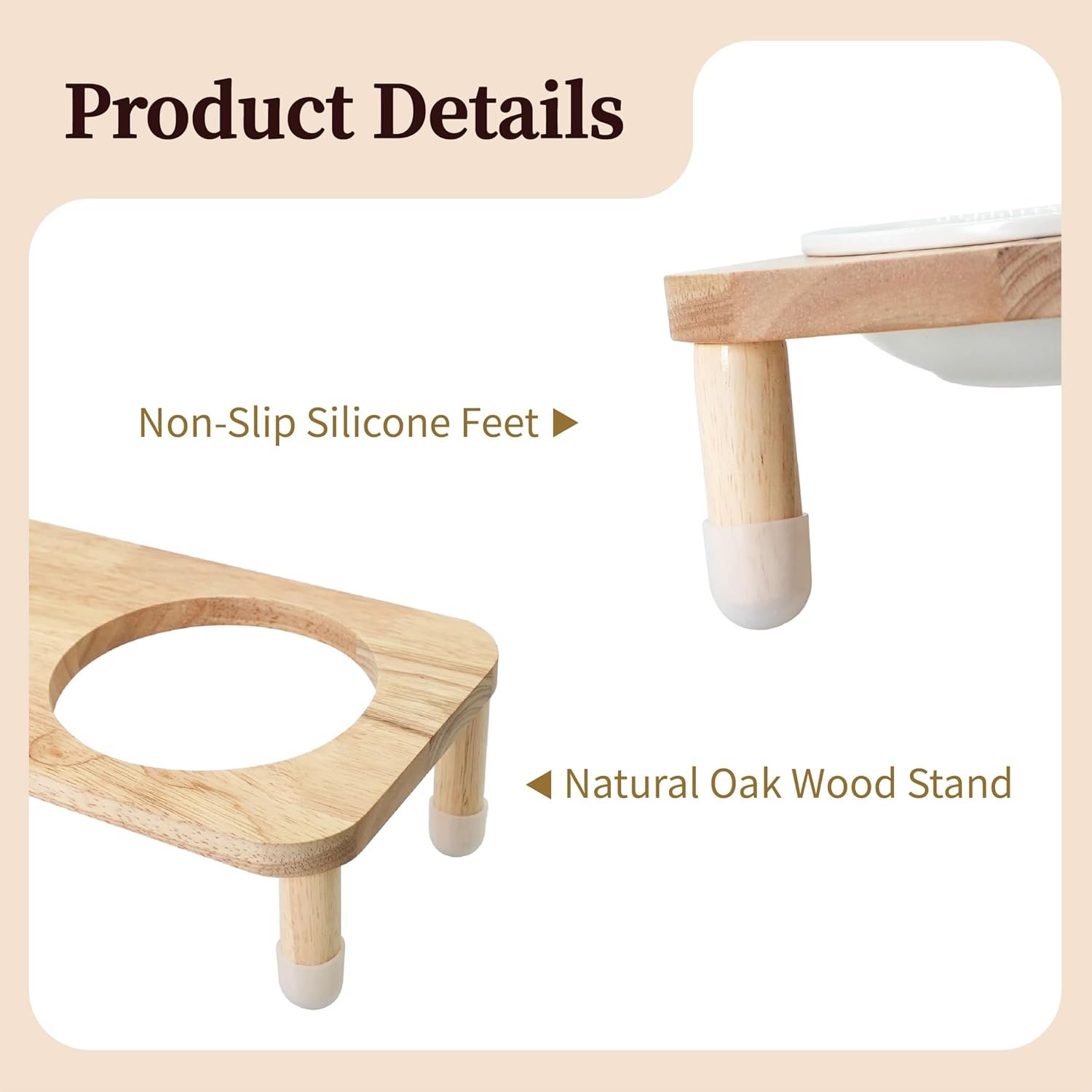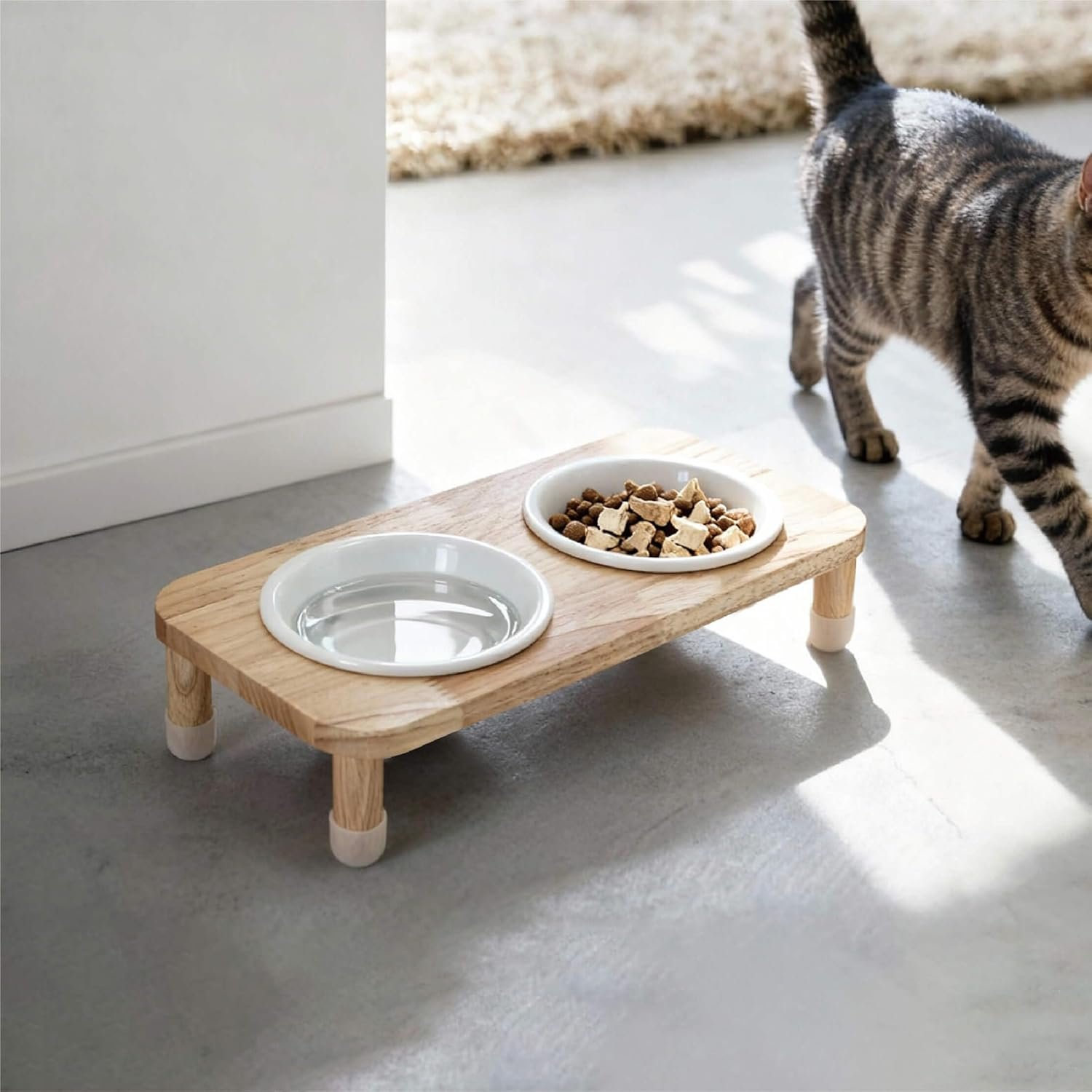 STABLE NON-SLIP SETUP: The robust wooden stand is fitted with 4 silicone anti-slip covers to prevent the bowls from tipping, sliding, or moving, ensuring a secure and mess-free mealtime experience on any floor surface.