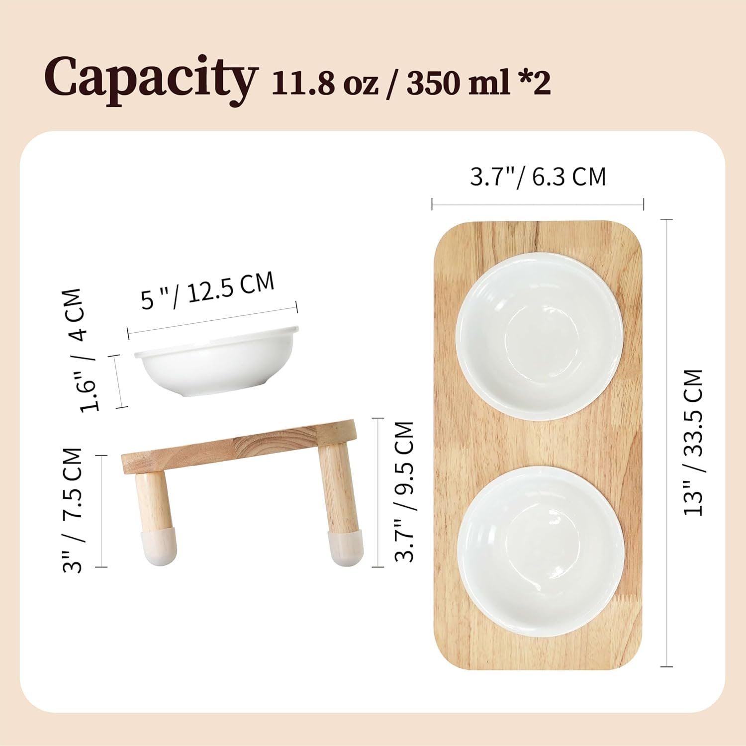 Raised Pet Feeder with Oak Stand – Ergonomic 350 ml Ceramic Double Bowl Set for Small Dogs & Cats (Oak Stand & 2 White Bowls)