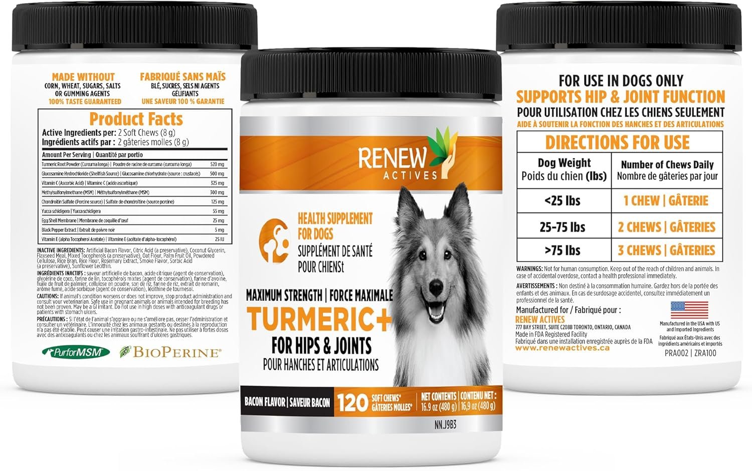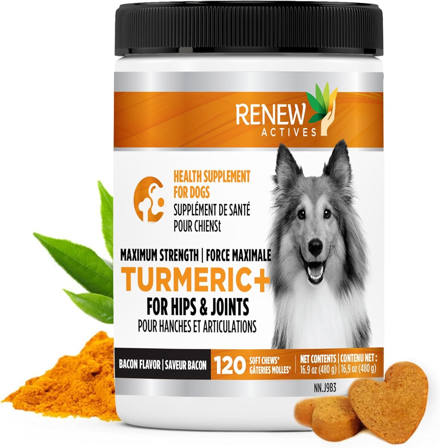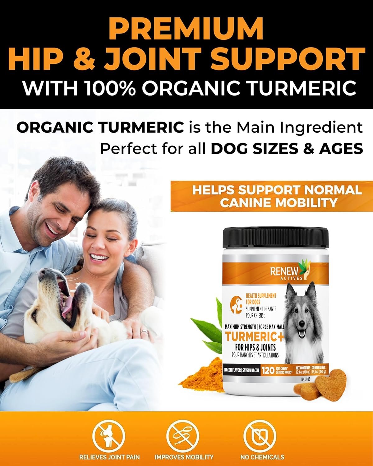 RENEW ACTIVES Organic Turmeric Soft Chews for Dogs – Daily Wellness Treat – 2 Chews per Serving – 120 Soft Chews