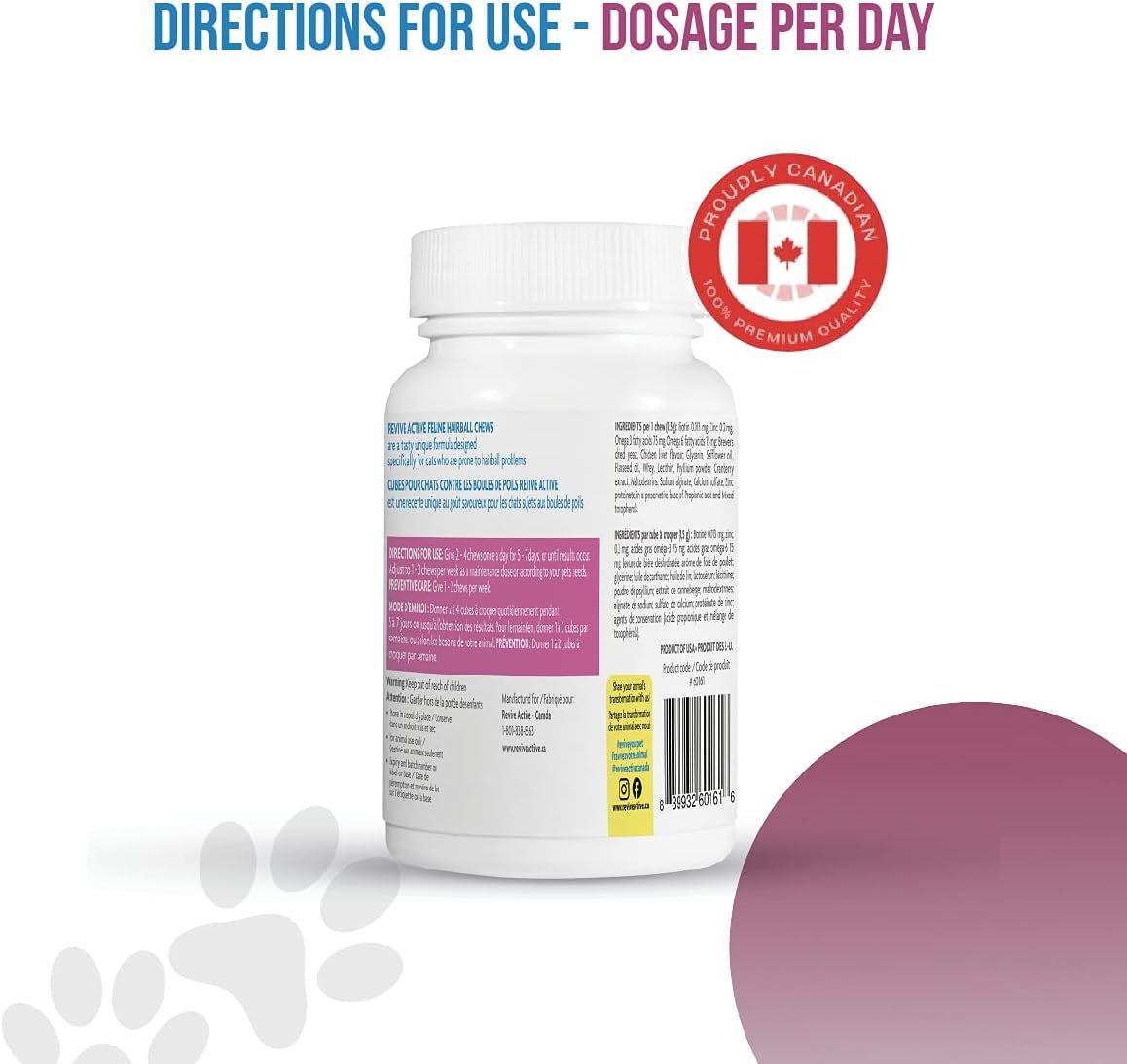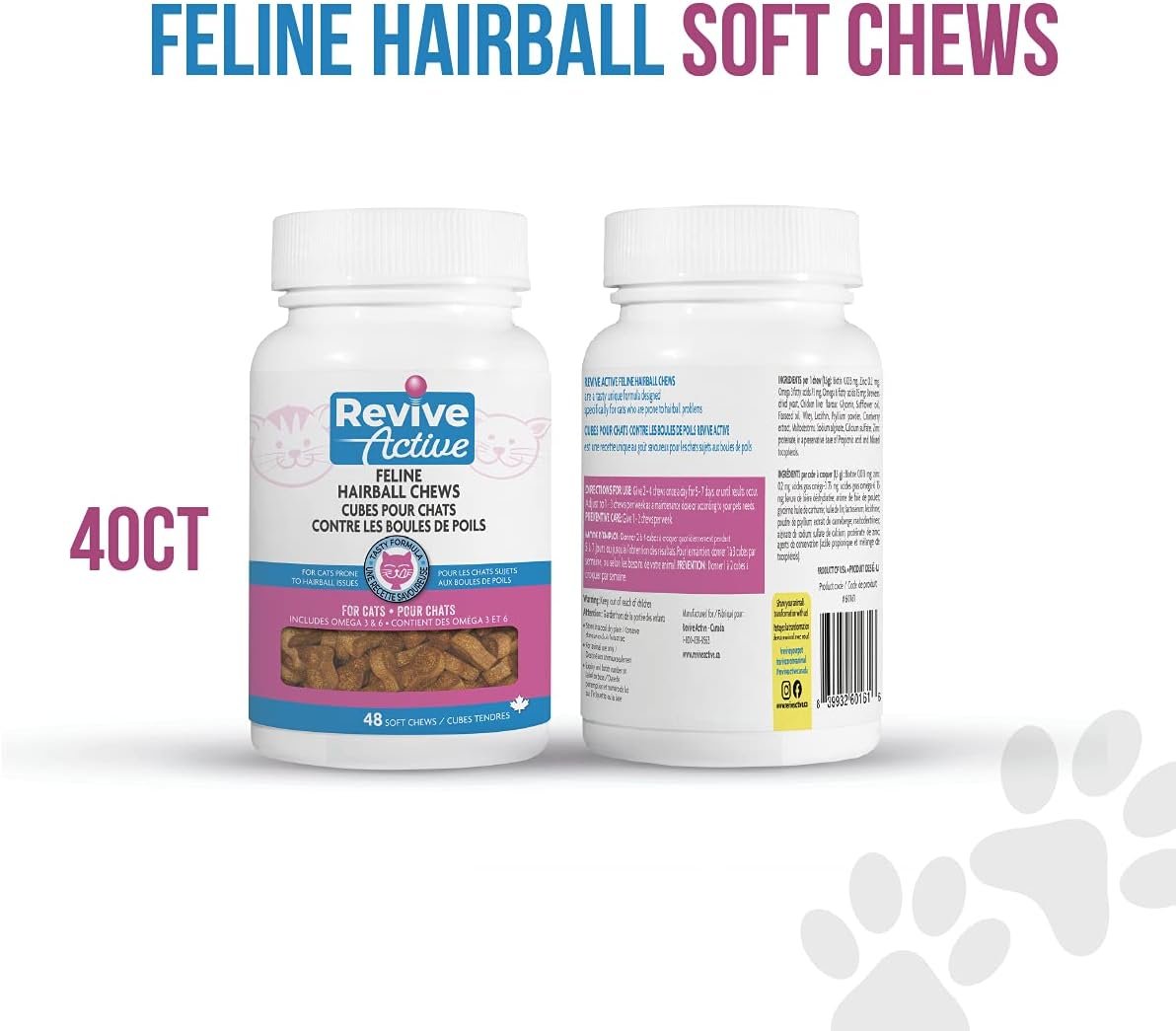 Hairball Relief with Skin and Coat Care Our delicious chicken flavoured Hairball Soft Chews are the cat’s meow! Not only do they provide hairball relief, but they also help maintain a healthy coat. Filled with Omega-3 and 6 Fatty Acids to support skin, coat and digestive health; plus lecithin, biotin and zinc for extra skin and coat support. Also with cranberry to support urinary tract health and psyllium soluble fibre to support GI tract health. See label for dosage information. INGREDIENTS per 1 chew (1.5g): Biotin 0.013 mg, Zinc 0.2 mg, Omega 3 fatty acids 75 mg, Omega 6 fatty acids 15 mg: Brewers dried yeast, Chicken liver flavour, Glycerin, Safflower oil, Flaxseed oil, Whey, Lecithin, Psyllium powder, Cranberry extract, Maltodextrins, Sodium alginate, Calcium sulfate, Zinc proteinate, in a preservative base of Propionic acid and Mixed tocopherols. Revive Active is committed to supporting your pet’s joint and mobilty care, immune system, skin and coat and dental health. ¡Only the best for your best friend!