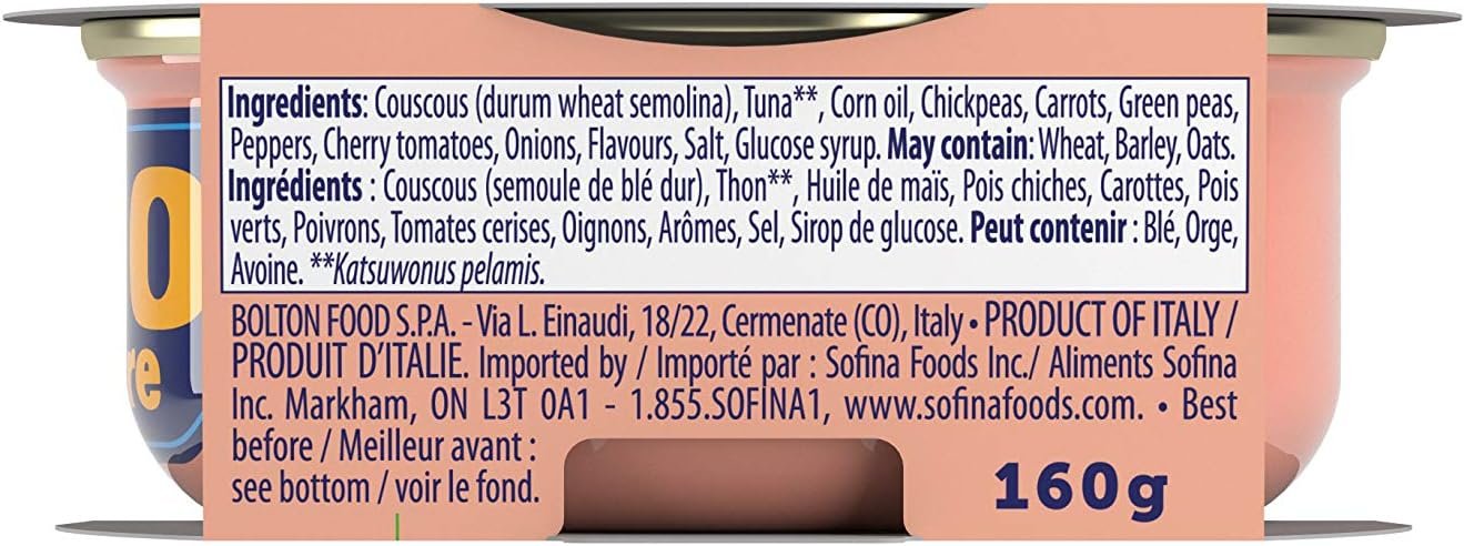 Ingredients: skipjack tuna (Katsuwonus pelamis), cous cous, corn oil, chickpeas, carrots, peas, peppers, cherry tomatoes, onions, flavourings, salt, glucose syrup