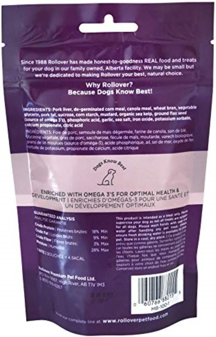 Rollover Mini Bites for Dogs are small, semi-soft, natural treats made with real pork liver. They are a good source of protein, are low in fat (approximately 4.5 calories each) and dogs love the taste, making them an excellent choice for a training treat. Our Mini Bites are available in 3 delicious recipes for dogs (Original, Omega 3 Enriched, and with Elk Velvet Antler). Feed as a treat and please always supervise your dog with any treat. Mini Bites for Dogs have a calorie content of approximately 4.5 calories/g.