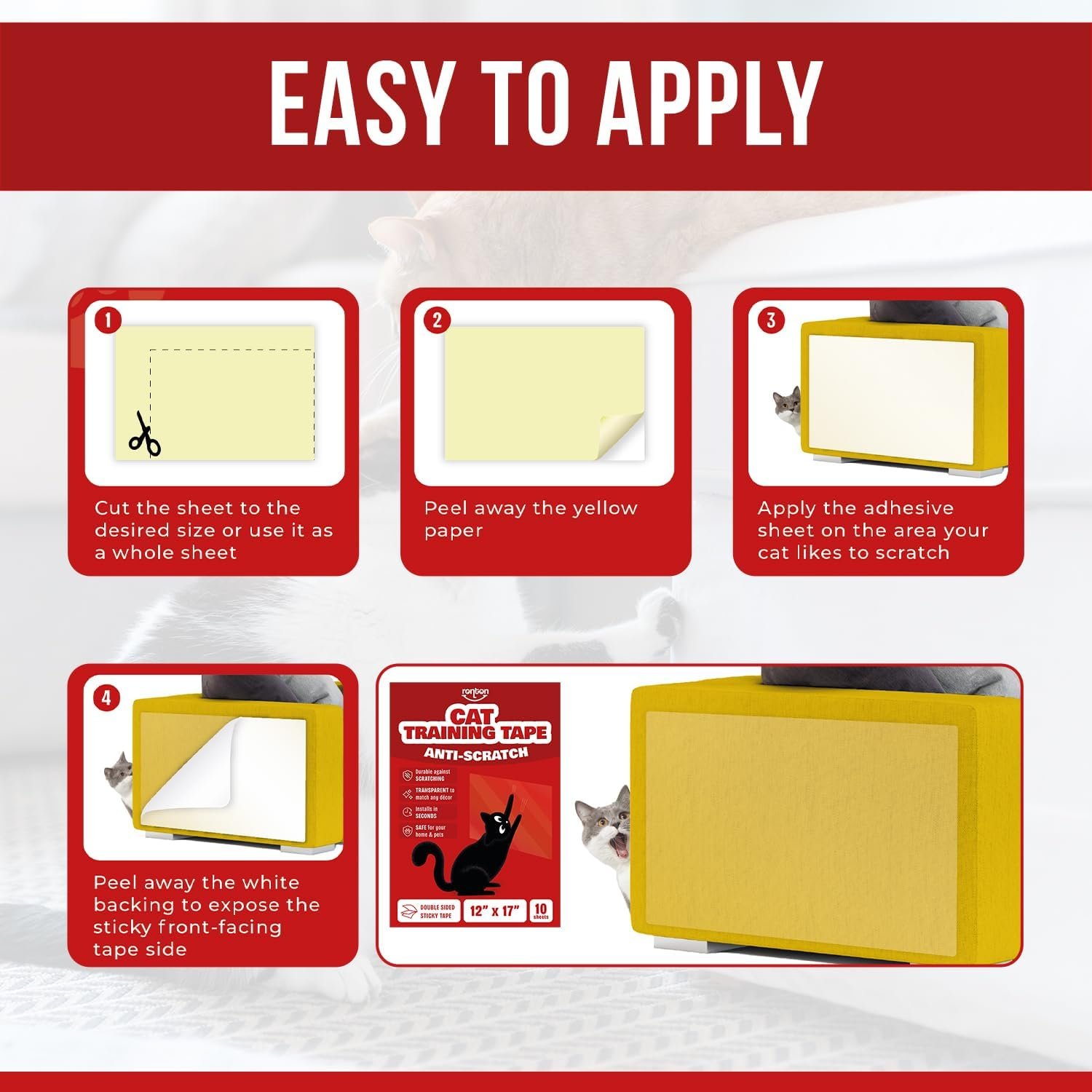 Ronton Cat Scratch Furniture Protector – Double Sided – Anti Cats Scratching Sticky Tape – No-Residue for Couch, Doors & Walls – 10 Sheets – XL 17″ L 12″ W Furniture Protectors – Clear Training Tape