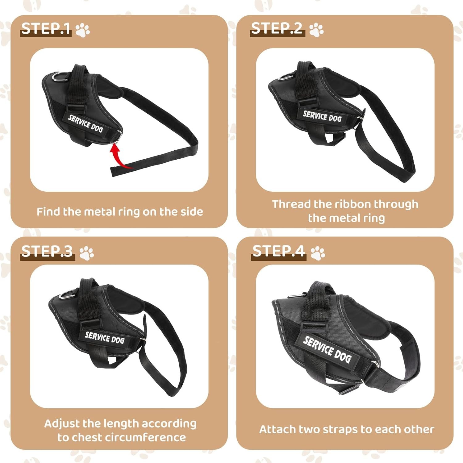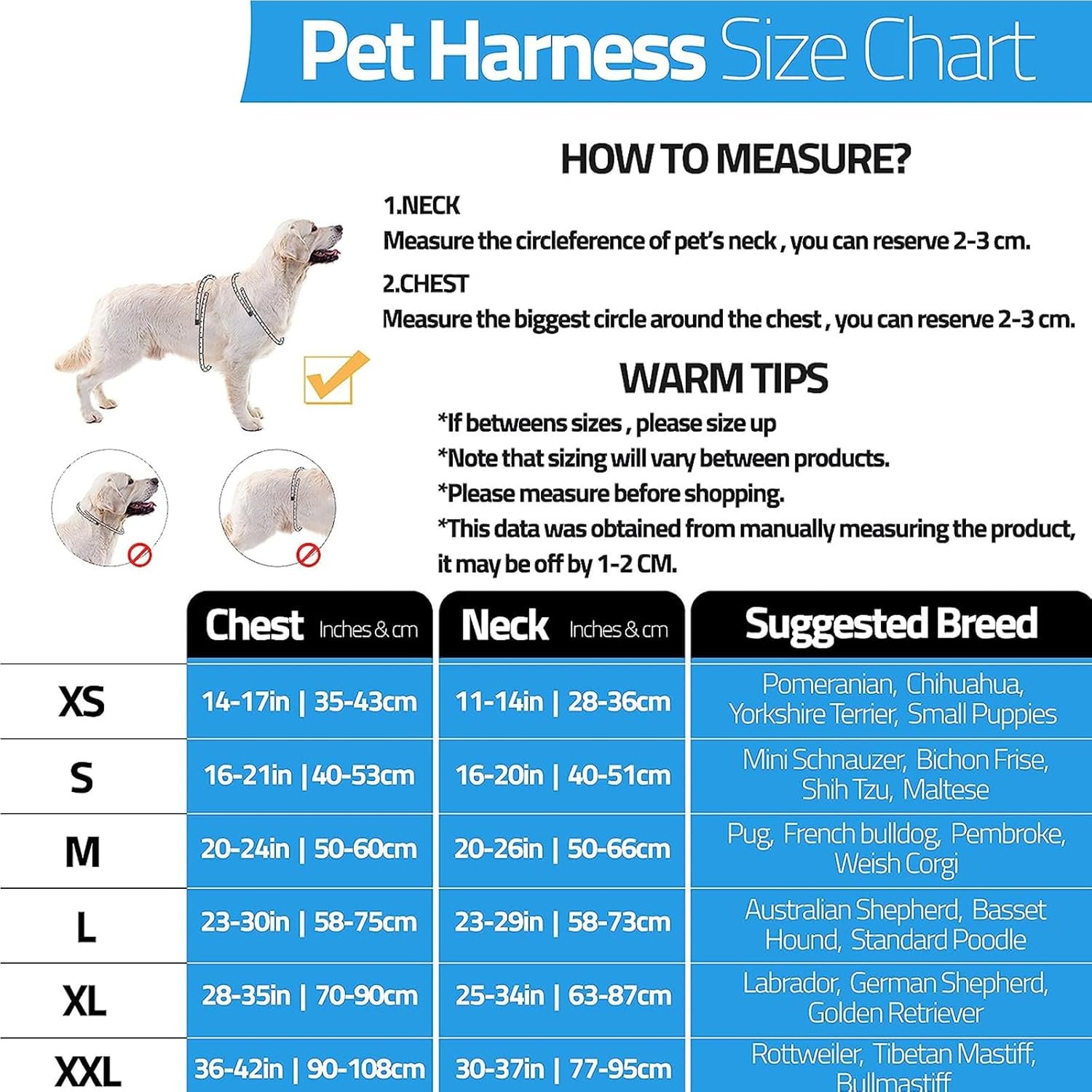 Our dog vest harness comes in sizes from XS-XXL for small, medium, and large breeds. With multiple colors to choose from, you have more options. Please measure around the widest part of your dog’s chest and neck before purchase to choose the right size (if between sizes, choose the larger size and set aside 1 inch). This harness is recommended for Labrador, Husky, Boxer, German Shepherd, Golden Retriever, Border Collie, American Pit Bull Terrier, Bulldog, and more.