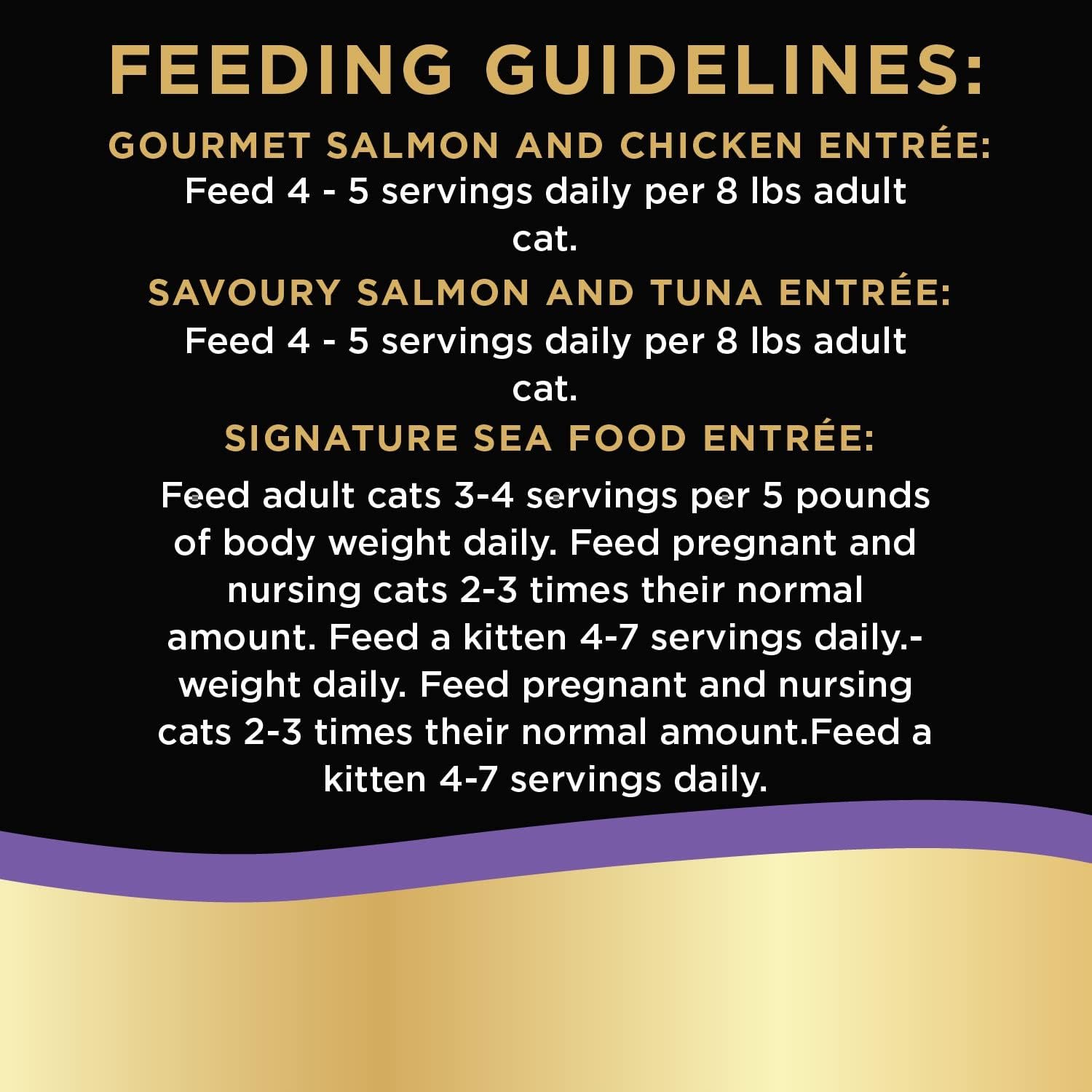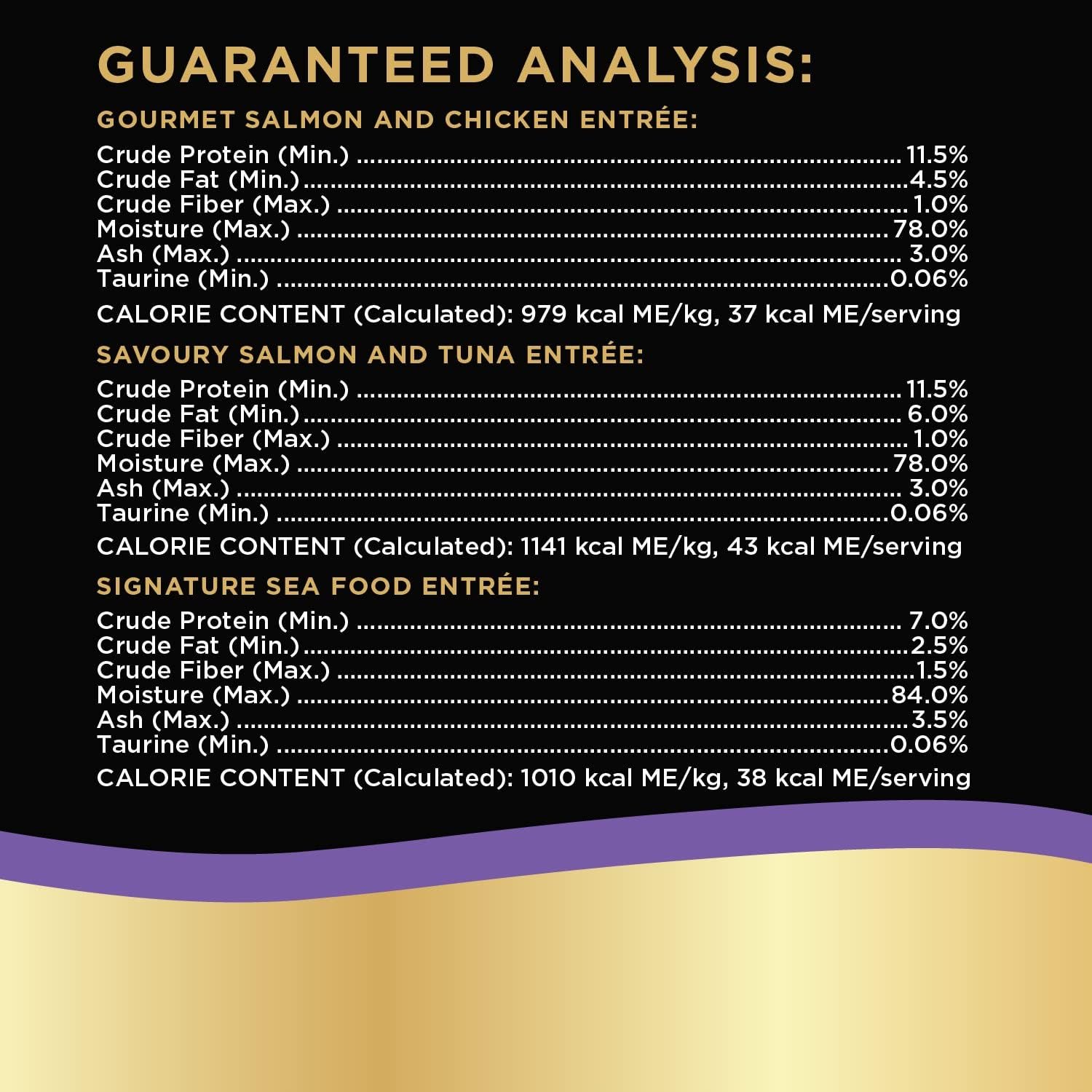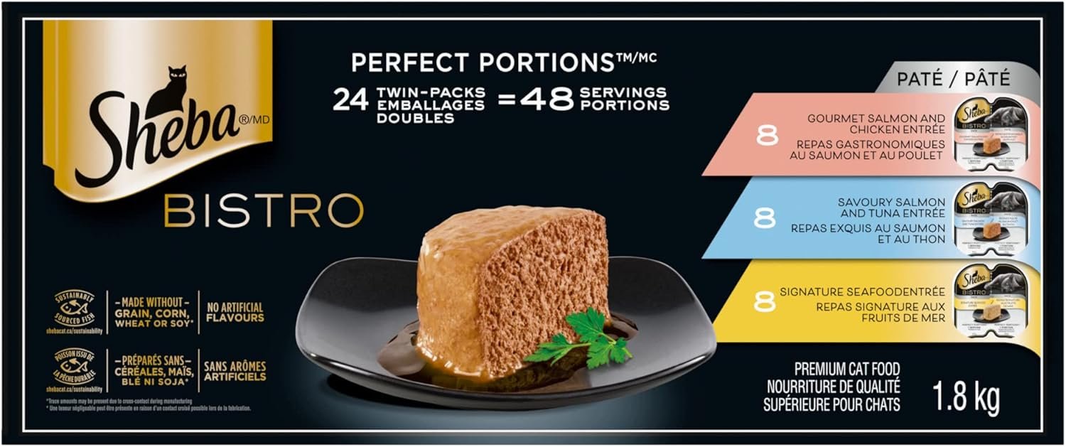 CONTAINS: one (1) 24-count case of 75g trays of SHEBA BISTRO PERFECT PORTIONS Adult Wet Cat Food Paté Gourmet Salmon & Chicken, Savoury Salmon & Tuna and Signature Seafood Entrée Variety Pack: (8) Gourmet Salmon & Chicken Entrée (8) Savoury Salmon & Tuna Entrée (8) Signature Seafood Entrée. (48 Servings Total)