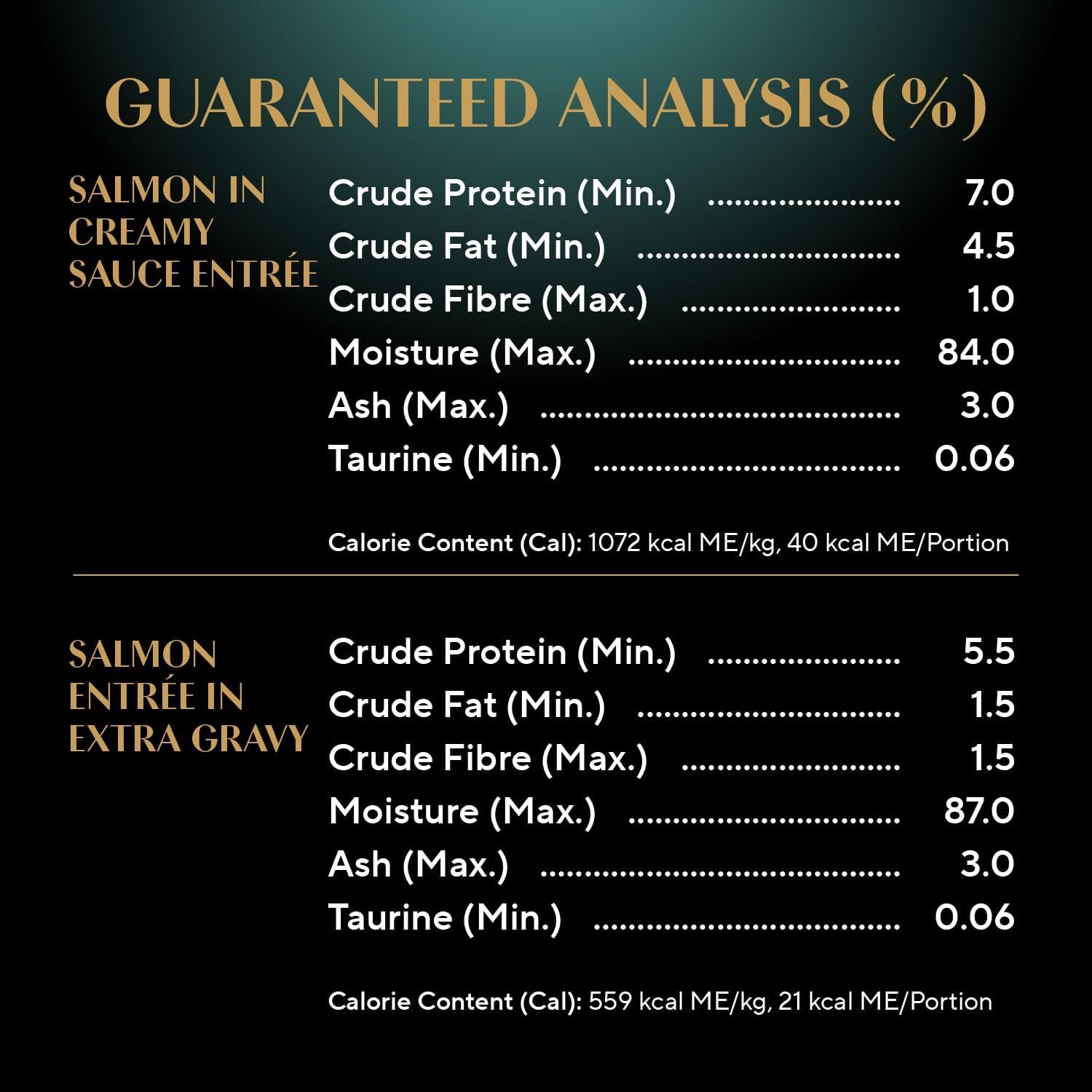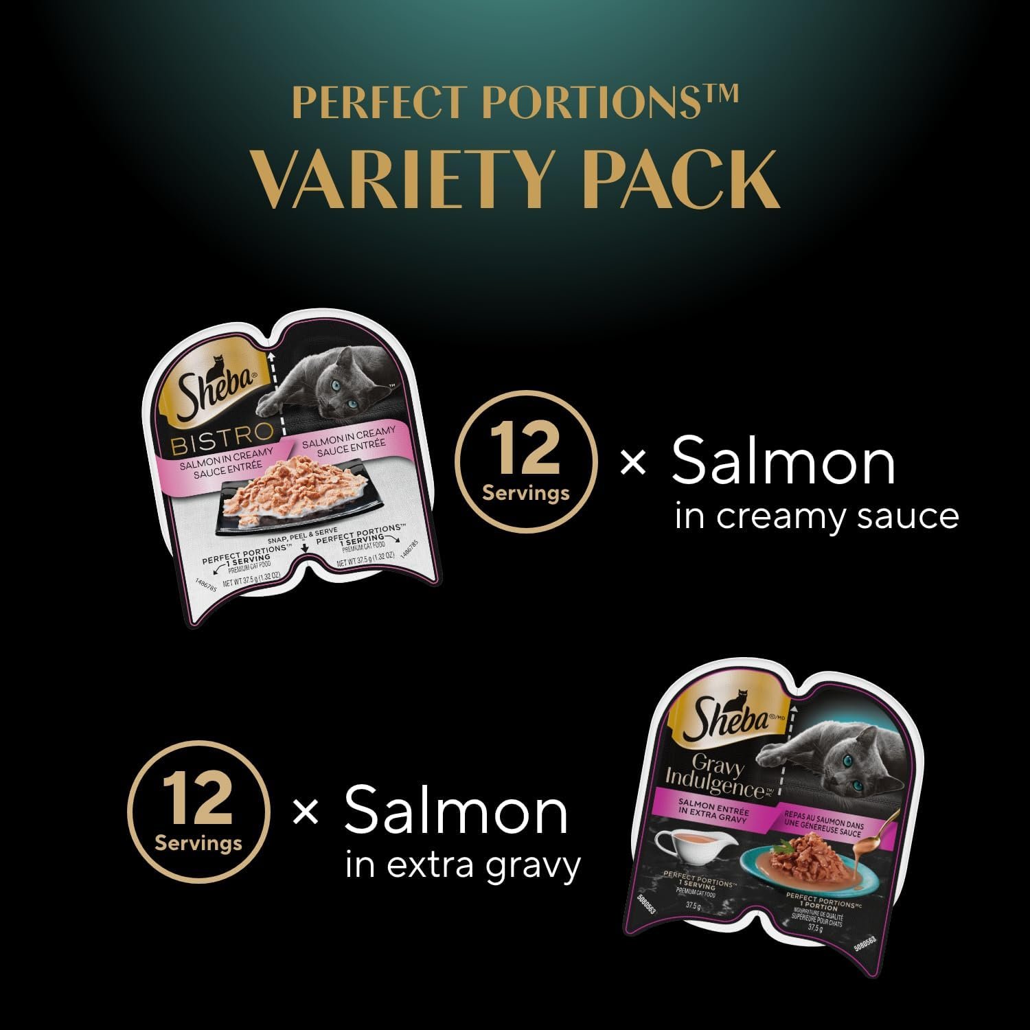 Contains one (1) 12-count case of 75g trays of SHEBA PERFECT PORTIONS Adult Wet Cat Food BISTRO Salmon in Creamy Sauce Entrée and GRAVY INDULGENCE Salmon Entrée in Extra Gravy Multipack: (6) Salmon in Creamy Sauce Entrée (6) Salmon Entrée in Extra Gravy. Two servings per pack. Total of 24 servings.