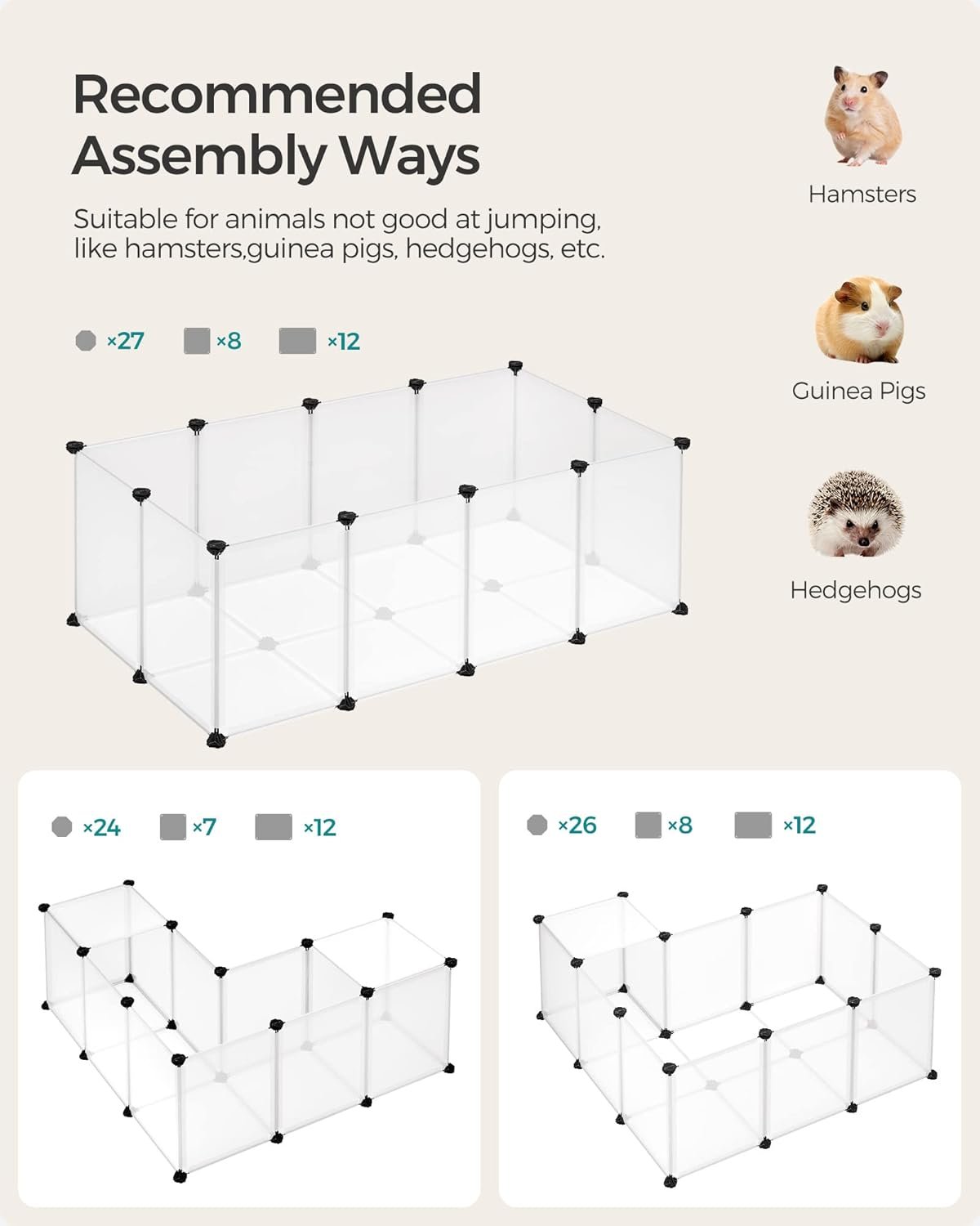 Small animals such as bunnies, guinea pigs, hamsters, ferrets, hedgehogs, or turtles will enjoy themselves in this playpen. For animals good at jumping, please refer to the recommended assembly ways so that the animals do not escape.